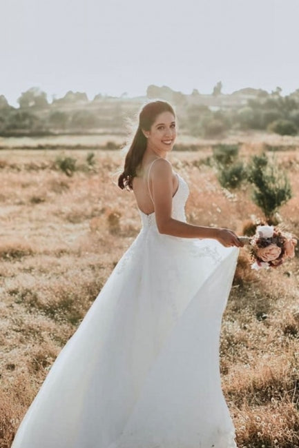Exquisitos vestidos de novia de encaje sin mangas, corte en A y hasta el suelo con tirantes finos