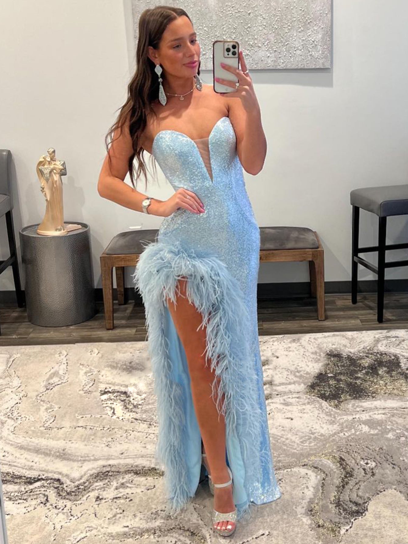 Experimenta la máxima elegancia con "Nyra", un vestido diseñado para quienes se atreven a brillar. Bañado en serenos tonos azul celeste y lila, este vestido de corte sirena, confeccionado en lujosa tela de lentejuelas, promete una noche estrellada. Su diseño sin tirantes realza con elegancia la clavícula y los hombros, culminando en un escote corazón que favorece cualquier figura. Cada paso revela una seductora abertura lateral, adornada con suaves y etéreas plumas, que le dan un toque de fantasía a este radiante atuendo. La cremallera en la espalda garantiza un ajuste perfecto, para que te sientas cómoda mientras conquistas la pista de baile.
