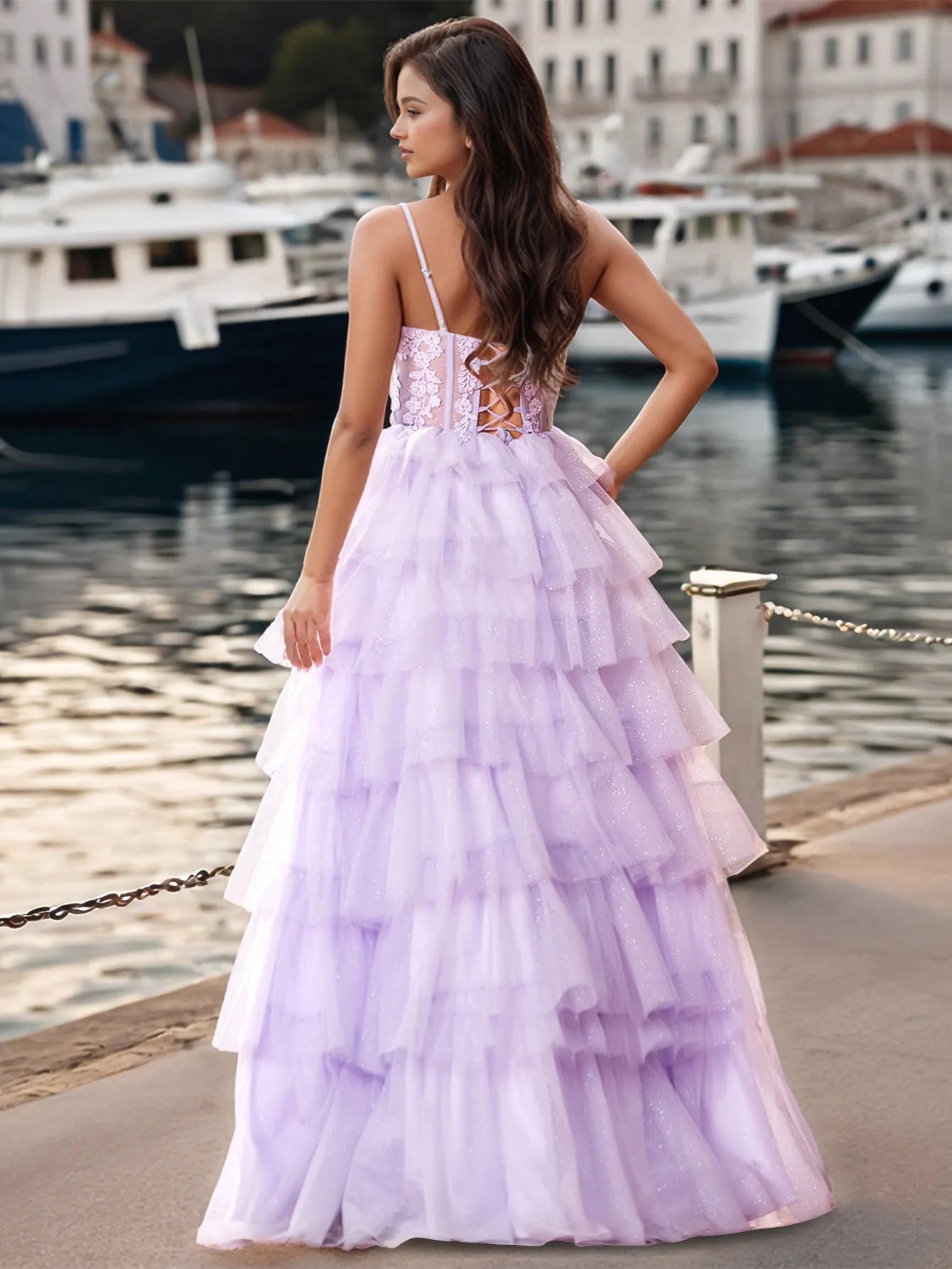 Vestido de fiesta escalonado con volantes de encaje brillante y corsé con apliques de flores