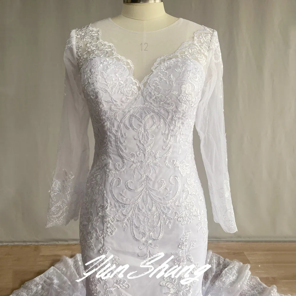 Precioso vestido de novia de sirena de encaje de manga larga, con tul, cola catedral, escote en V, apliques y espalda abotonada.