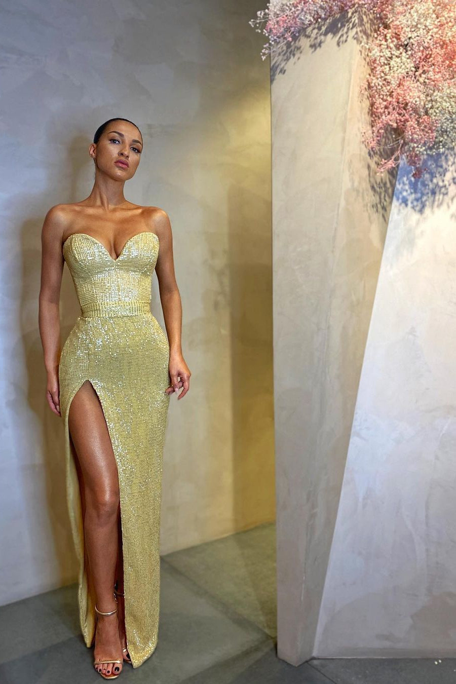 Vestido de fiesta moderno con abertura, estilo sirena, lentejuelas, escote corazón
