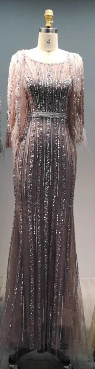 Vestido de noche gris sirena de manga larga estilo Dubai, lujoso vestido formal con cuello redondo y pedrería de diamantes 2025 LA70503