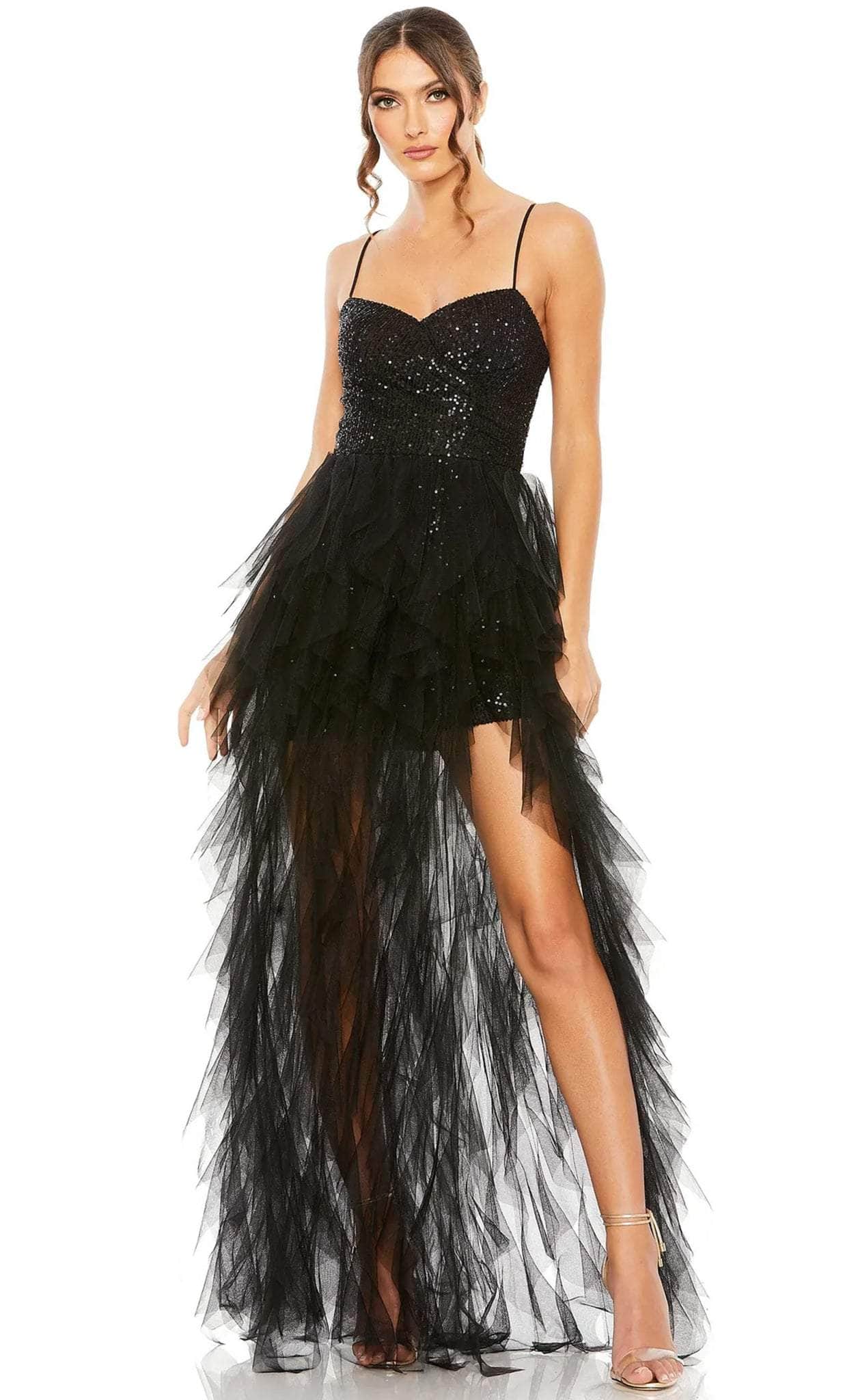 Este impresionante diseño de Mac Duggal (modelo 27119) irradia un estilo magnífico que cautivará a quienes buscan la máxima sofisticación. El corpiño ajustado sin mangas, completamente adornado con lentejuelas brillantes, se sostiene con tirantes finos que se unen en una espalda semiabierta, la cual se cierra con una cremallera central. El escote es de tipo corazón. La falda con volantes tiene un corte asimétrico y una abertura que deja entrever la piel. Con este llamativo vestido de Mac Duggal (modelo 27119), sin duda atraerás todas las miradas. La modelo luce el color negro.