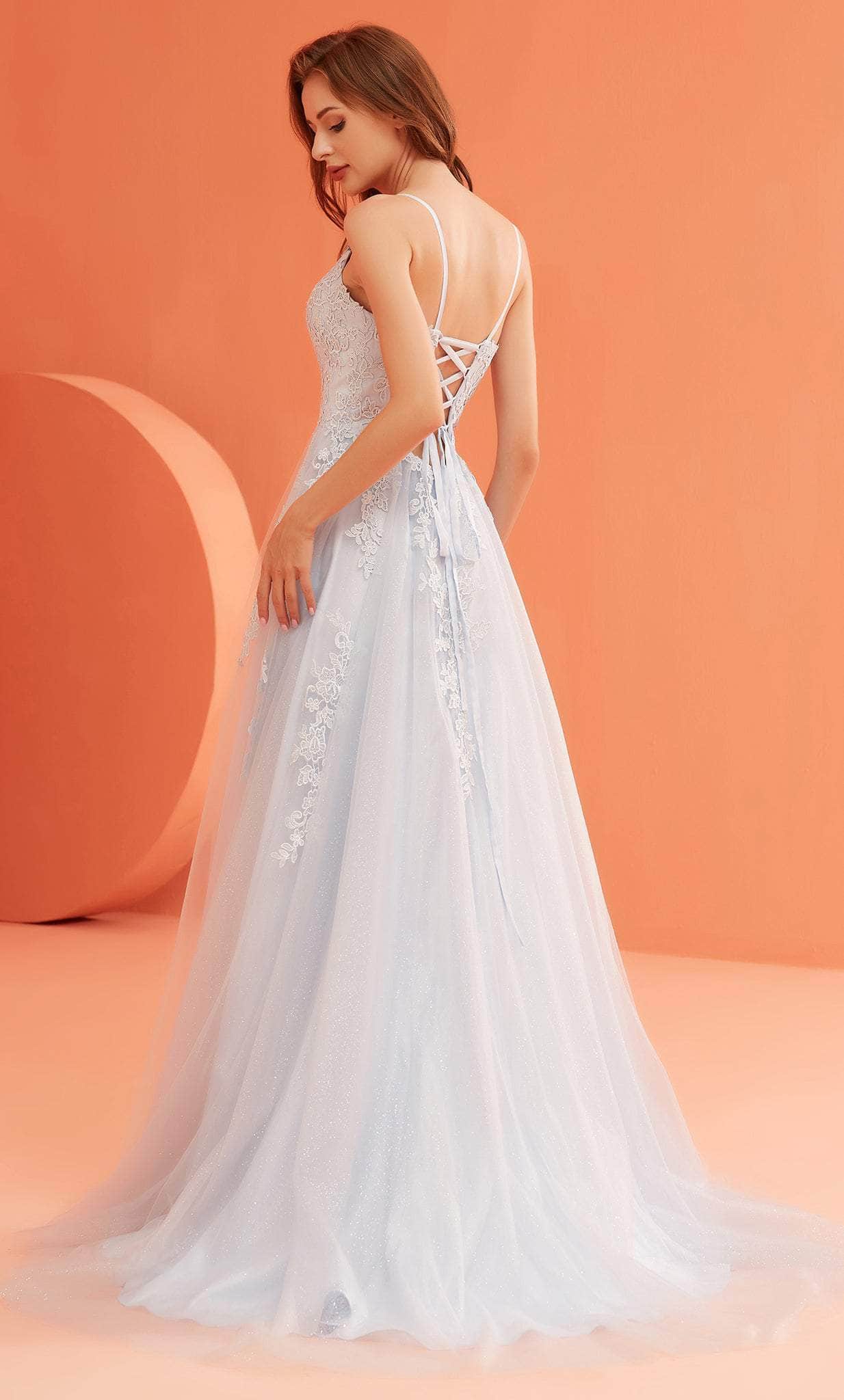 Deslumbra con encanto y elegancia con este vestido J'Adore Dresses J22022. El vestido sin mangas está adornado con un delicado bordado de encaje que recorre desde el cuello hasta la cintura. Luce un profundo escote en V, tirantes finos y un corsé con cordones en la espalda. Su abertura hasta el muslo realza tus piernas. La falda, de corte en A, cae en una elegante cola. Resalta tus mejores atributos y cautiva a todos con este diseño J'Adore Dresses J22022. Las modelos lucen los colores Paloma, Azul Marino y Rojo.