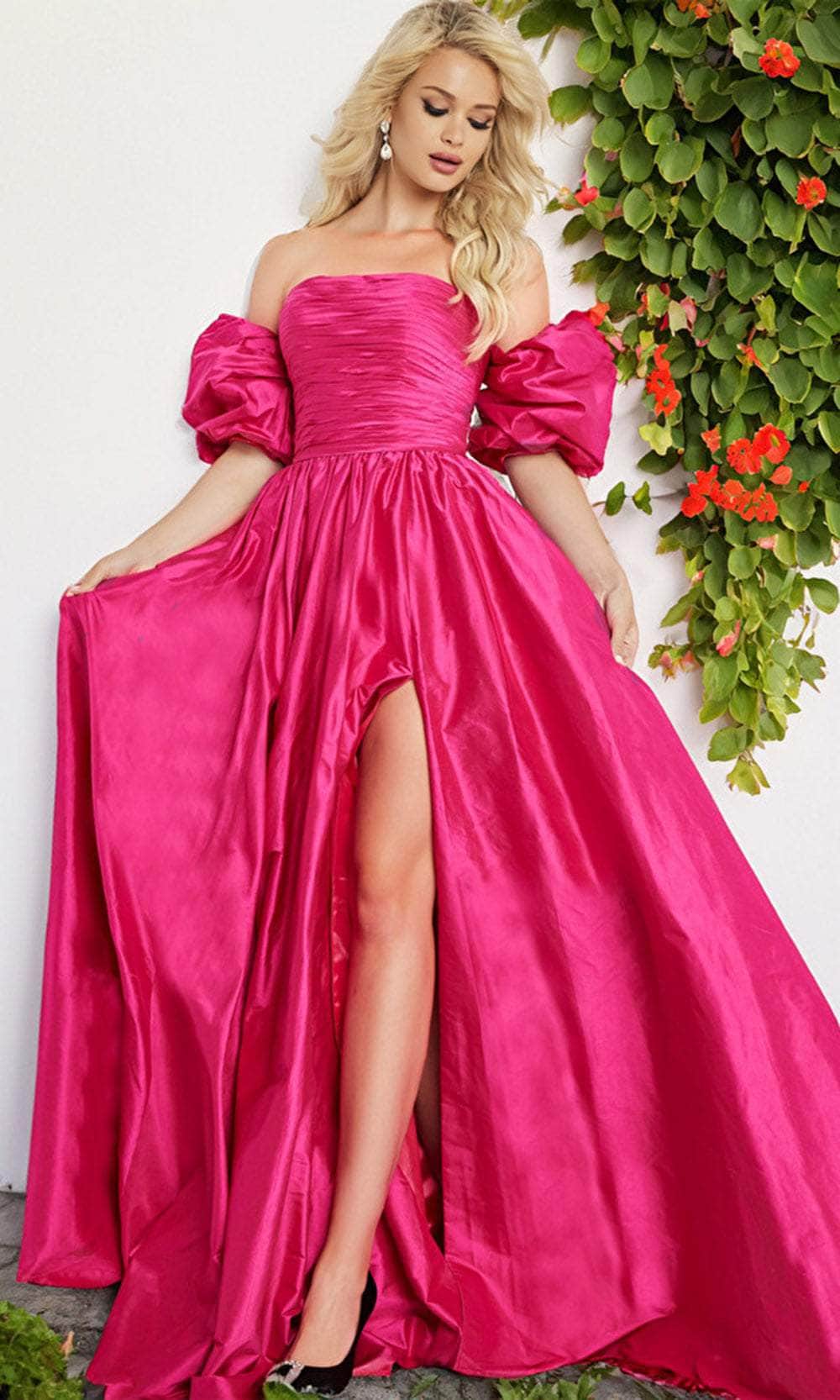 Irradia encanto y elegancia con nuestro vestido Jovani 24099. Sus mangas abullonadas le dan un toque de dramatismo y sofisticación. El corpiño drapeado realza tus curvas naturales, mientras que la abertura alta añade un toque de sensualidad y permite una gran libertad de movimiento. Ya sea para un evento formal o una ocasión especial, este vestido strapless es una elección atemporal que dejará huella. ¡Eleva tu estilo con el Jovani 24099 y deslumbra en tu próximo evento! La modelo luce el color fucsia.