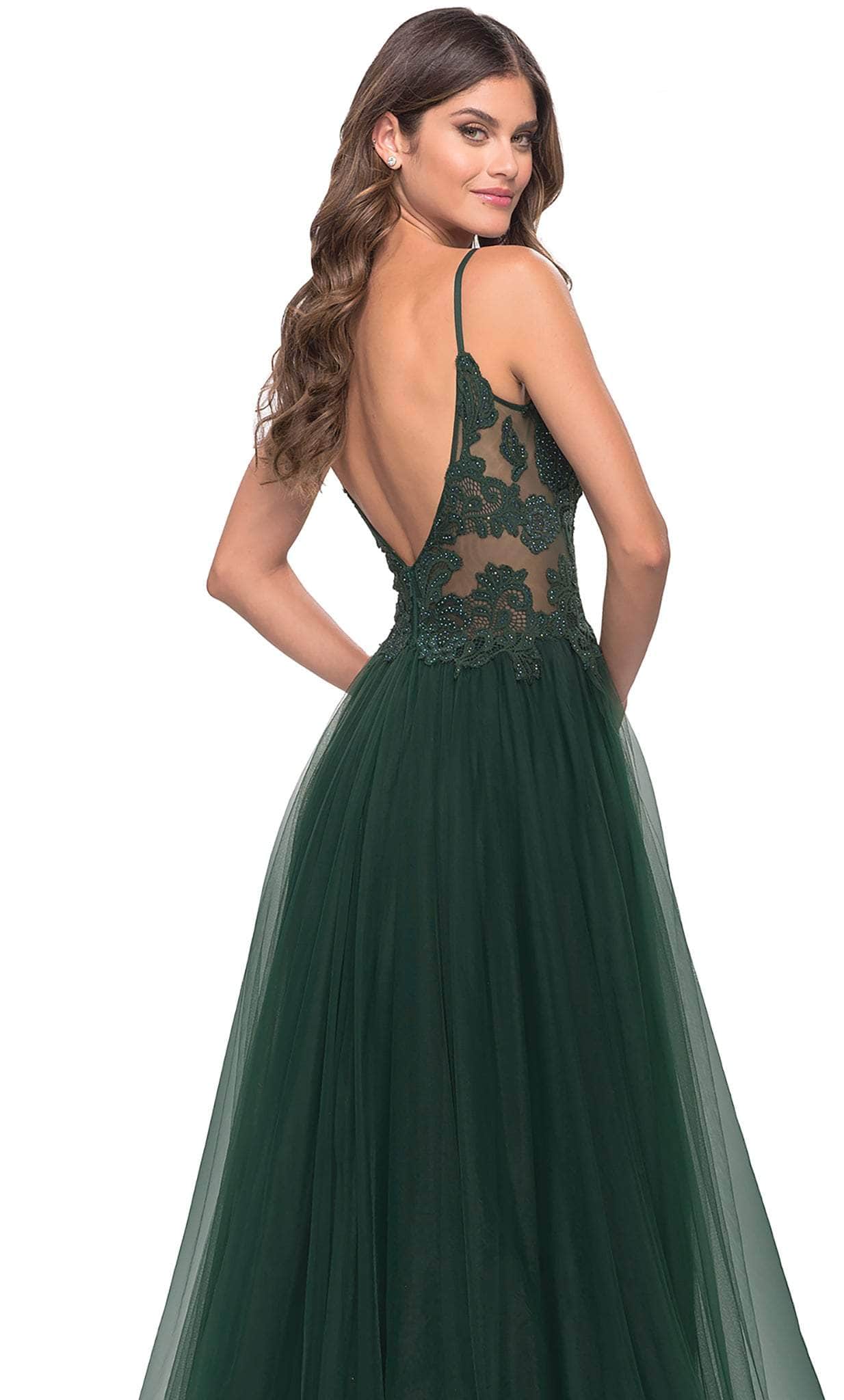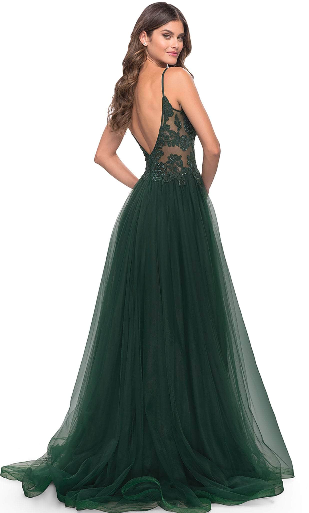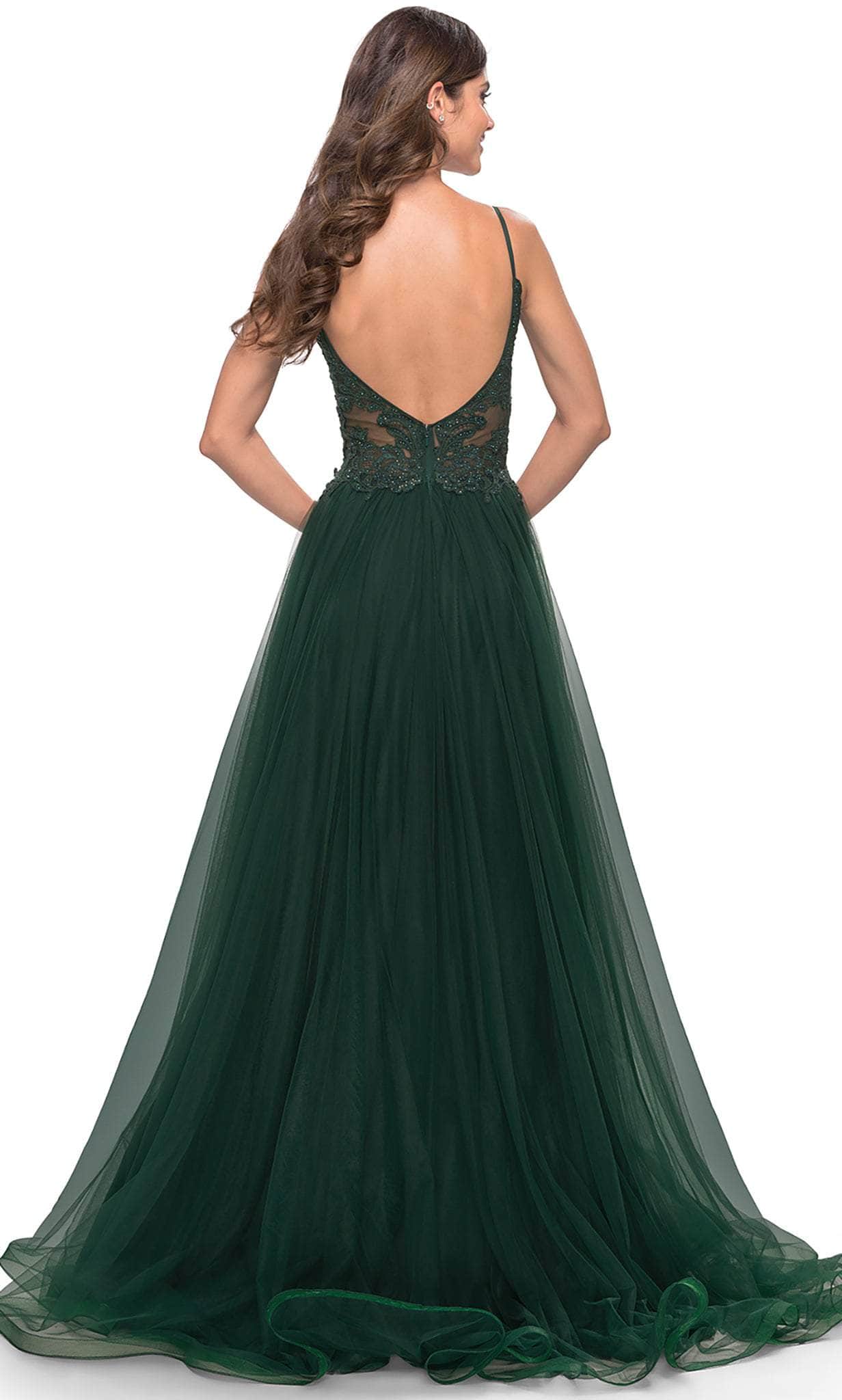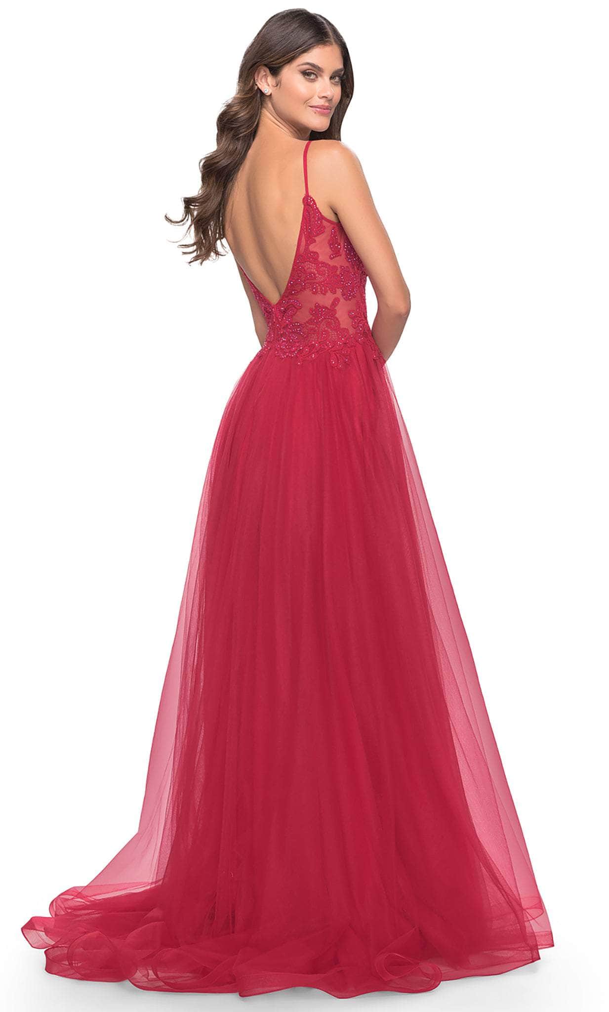 Deslumbra a todos con esta seductora creación de La Femme 31507. Con un diseño elegante de líneas definidas y adornado con encaje floral y pedrería, este impresionante vestido luce un escote en V pronunciado con una inserción transparente y tirantes finos. Su espalda abierta en V también está adornada. La falda de capas etéreas revela una sensual abertura que cae hasta el suelo con una elegante caída. Brilla en tu evento más espectacular con esta excepcional obra maestra de La Femme. Las modelos lucen los colores Verde Esmeralda Oscuro, Malva Polvoriento y Rojo.