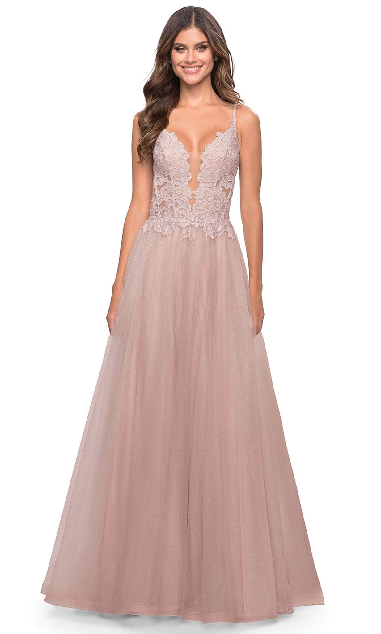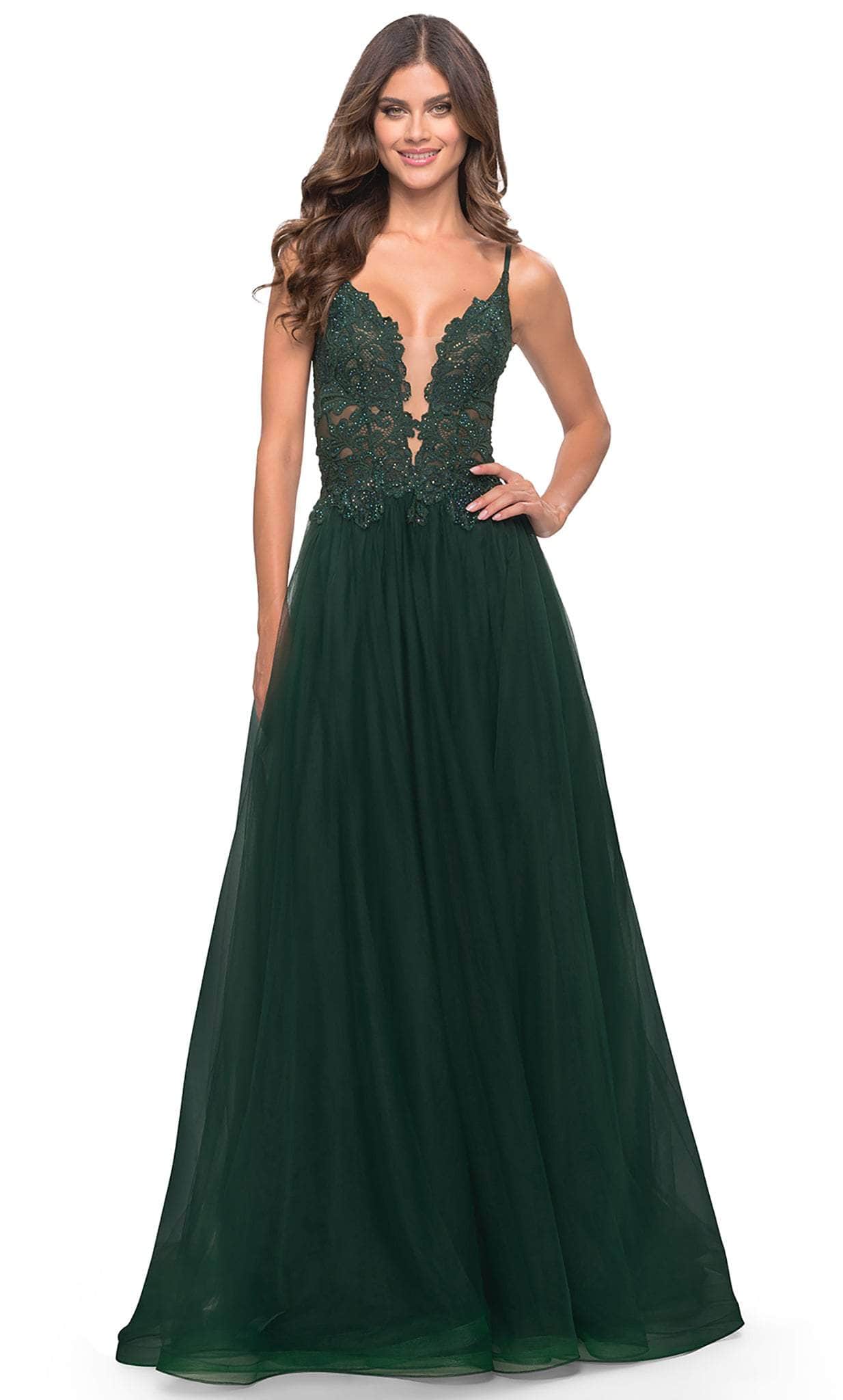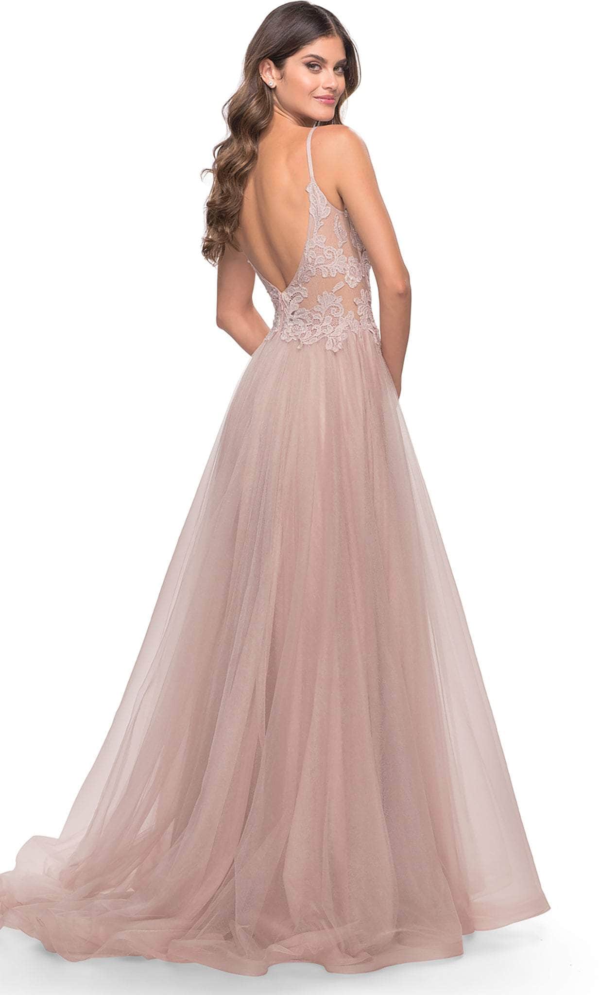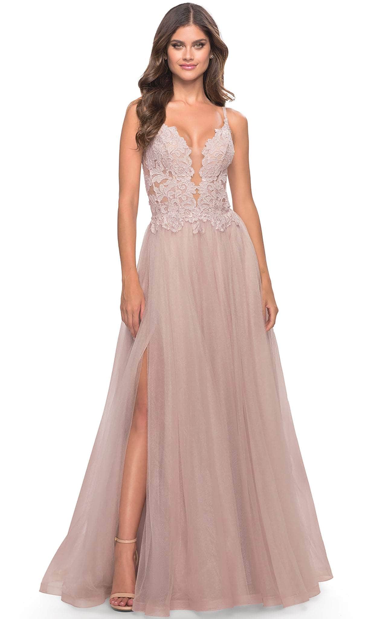 Deslumbra a todos con esta seductora creación de La Femme 31507. Con un diseño elegante de líneas definidas y adornado con encaje floral y pedrería, este impresionante vestido luce un escote en V pronunciado con una inserción transparente y tirantes finos. Su espalda abierta en V también está adornada. La falda de capas etéreas revela una sensual abertura que cae hasta el suelo con una elegante caída. Brilla en tu evento más espectacular con esta excepcional obra maestra de La Femme. Las modelos lucen los colores Verde Esmeralda Oscuro, Malva Polvoriento y Rojo.