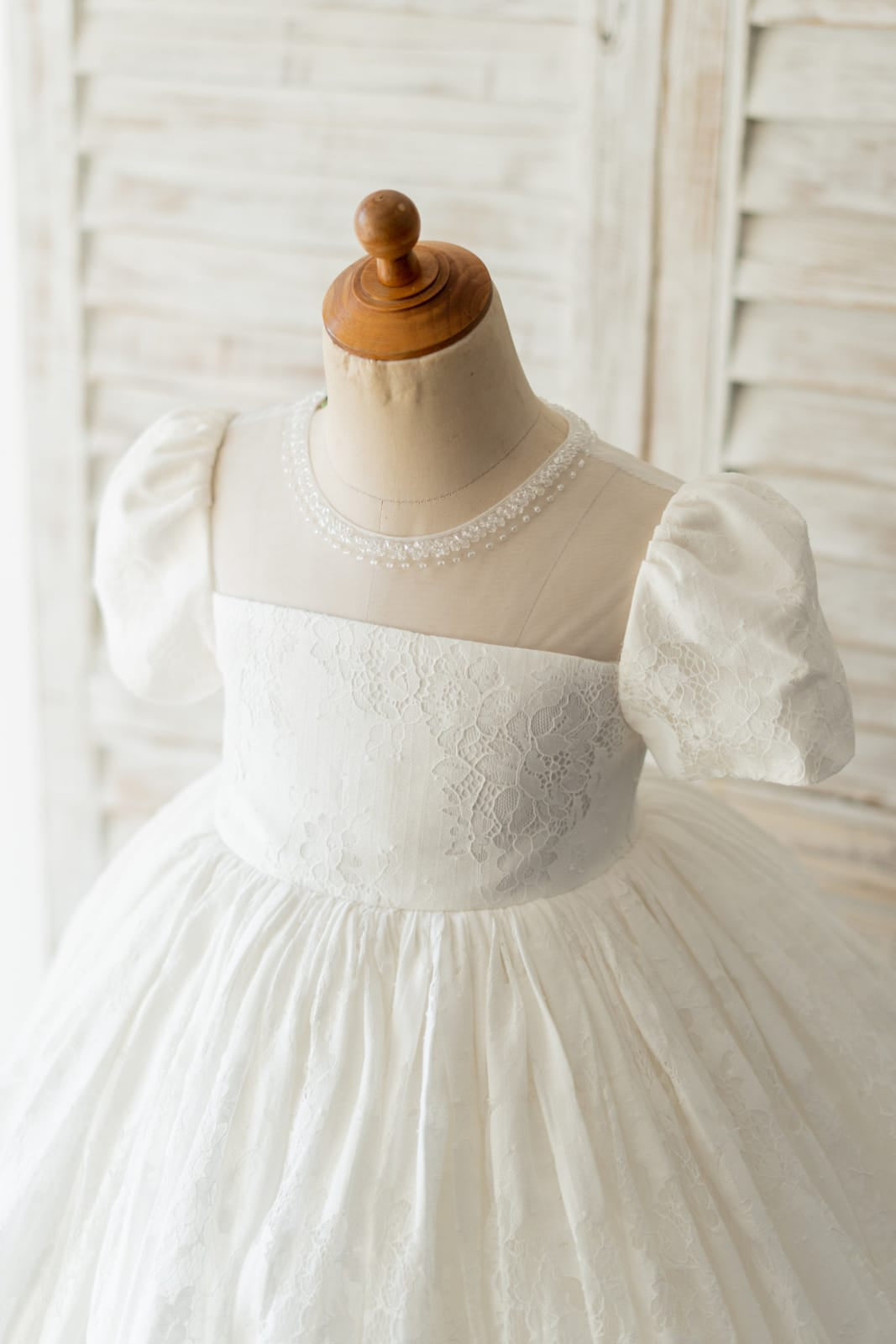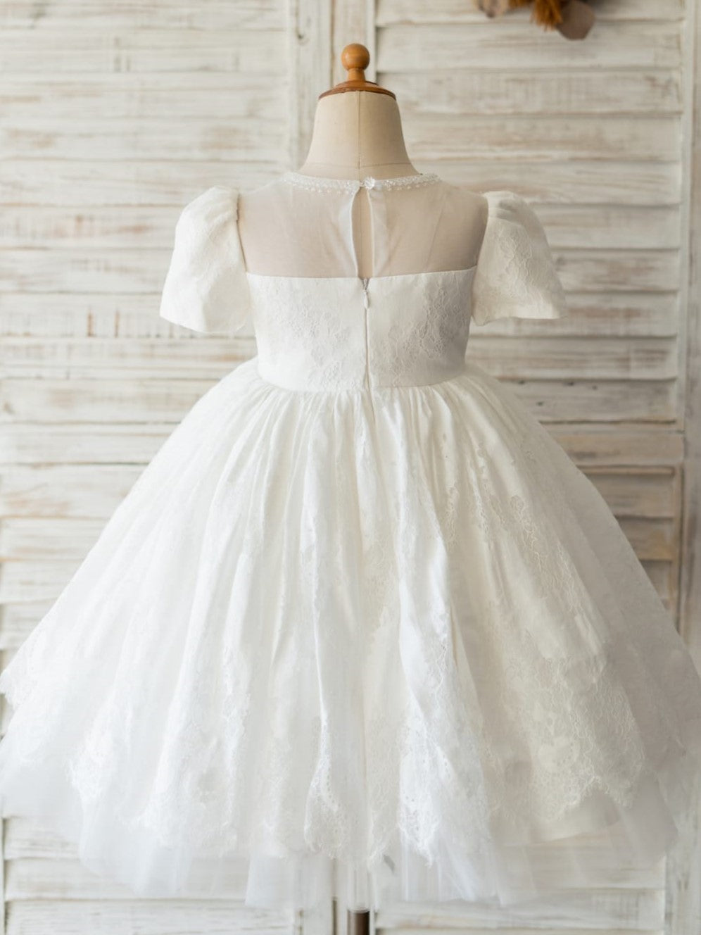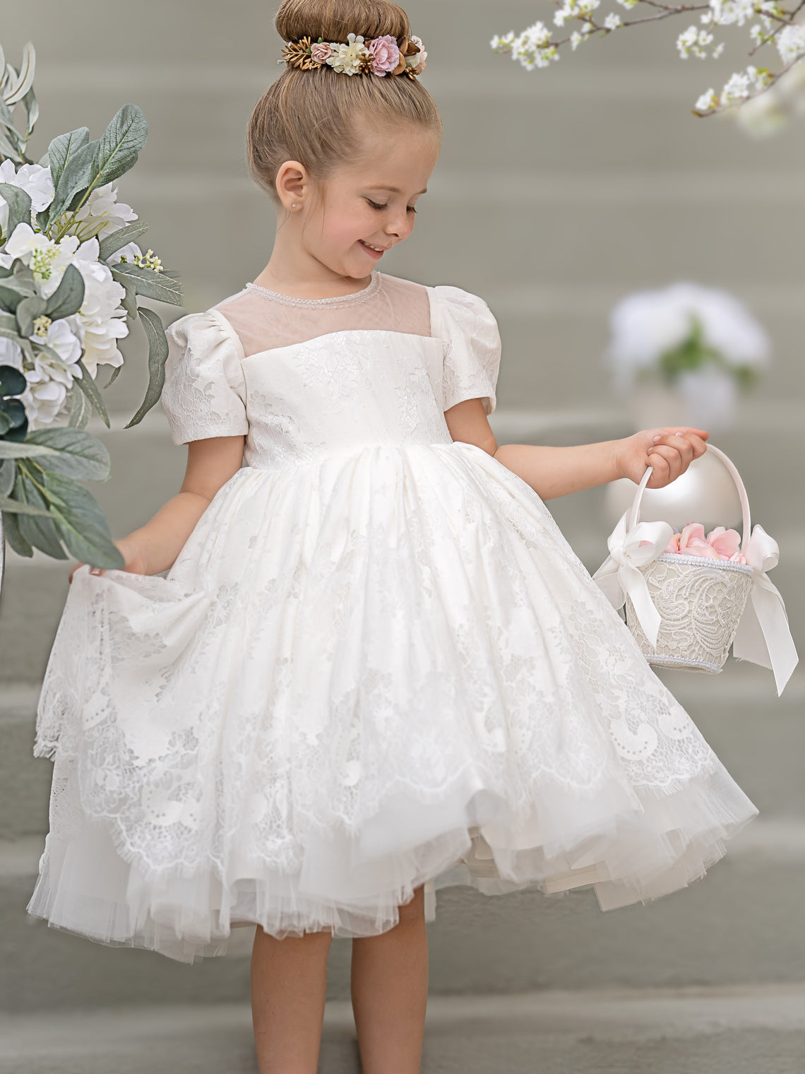Vestido de niña de las flores de la Primera Comunión de encaje hasta la rodilla