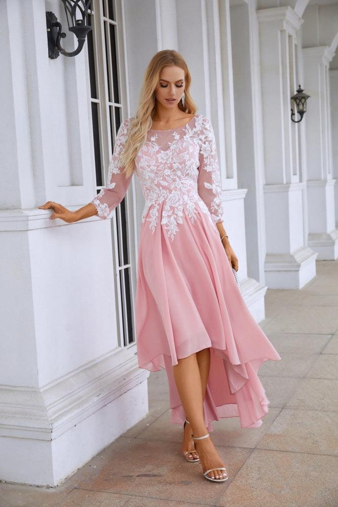 Vestido de noche para dama de honor, de gasa, con cuello redondo, manga larga y encaje, corto por delante y por detrás, largo hasta la rodilla, para boda, 28123