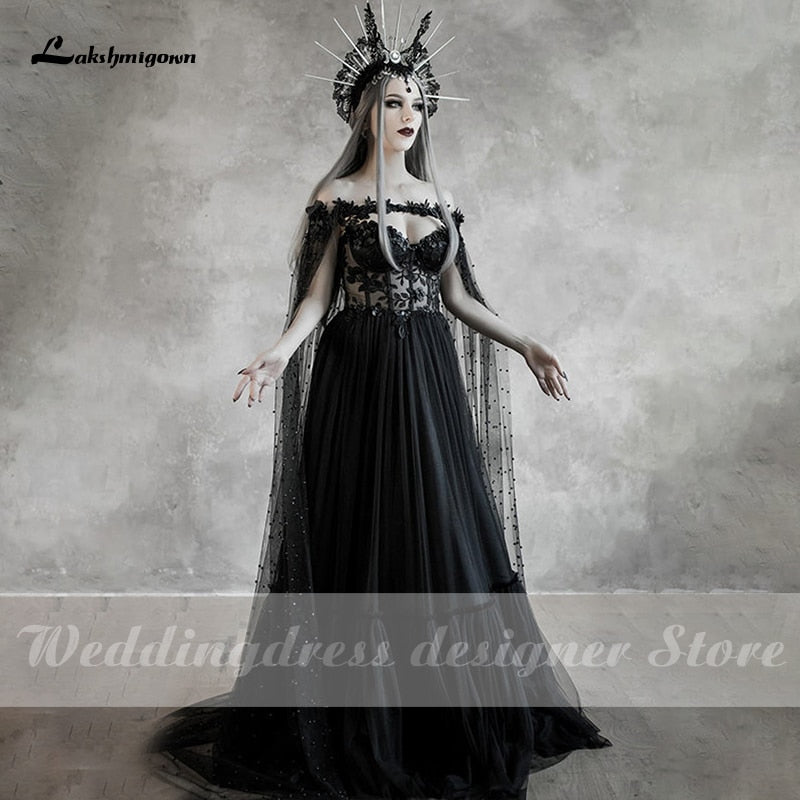 Vestido de novia gótico negro de cuento de hadas oscuro de Baoleely Lakshmigow con corpiño de corsé con copas, vestido de novia de fantasía, capa de boda de Halloween