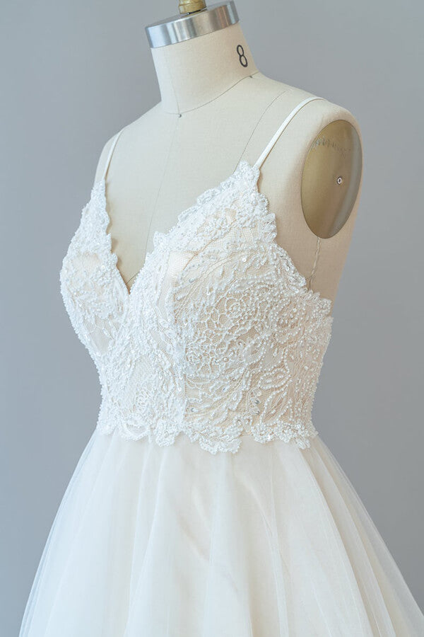Vestido de novia largo de corte A, tirantes finos, encaje y tul, sin espalda