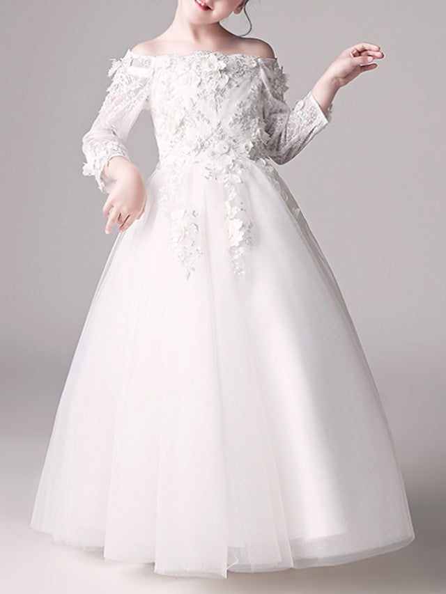 Vestido largo de gala con hombros descubiertos para niña de las flores en la primera comunión, con mangas.