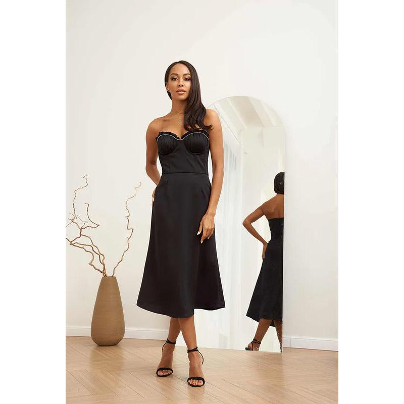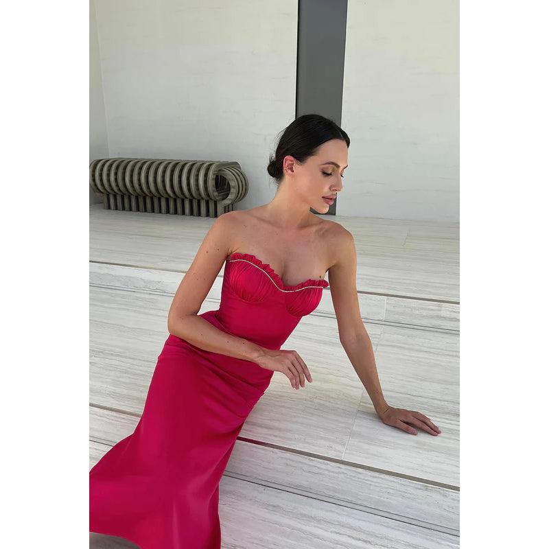 Vestido de fiesta de noche midi de satén fruncido con cuentas, sin mangas y sin tirantes con escote corazón
