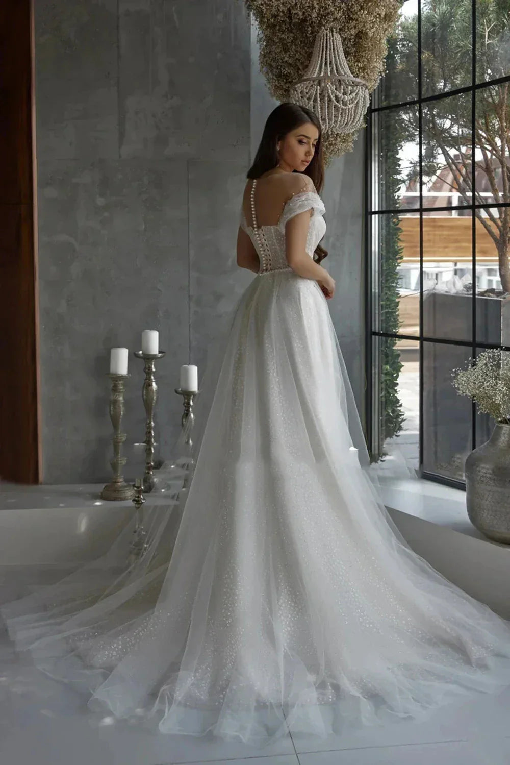 Vestido de novia de sirena, lujoso y elegante, con encaje, pedrería, hombros descubiertos y textura vaporosa. Nuevo modelo 2023 con apliques de hadas.