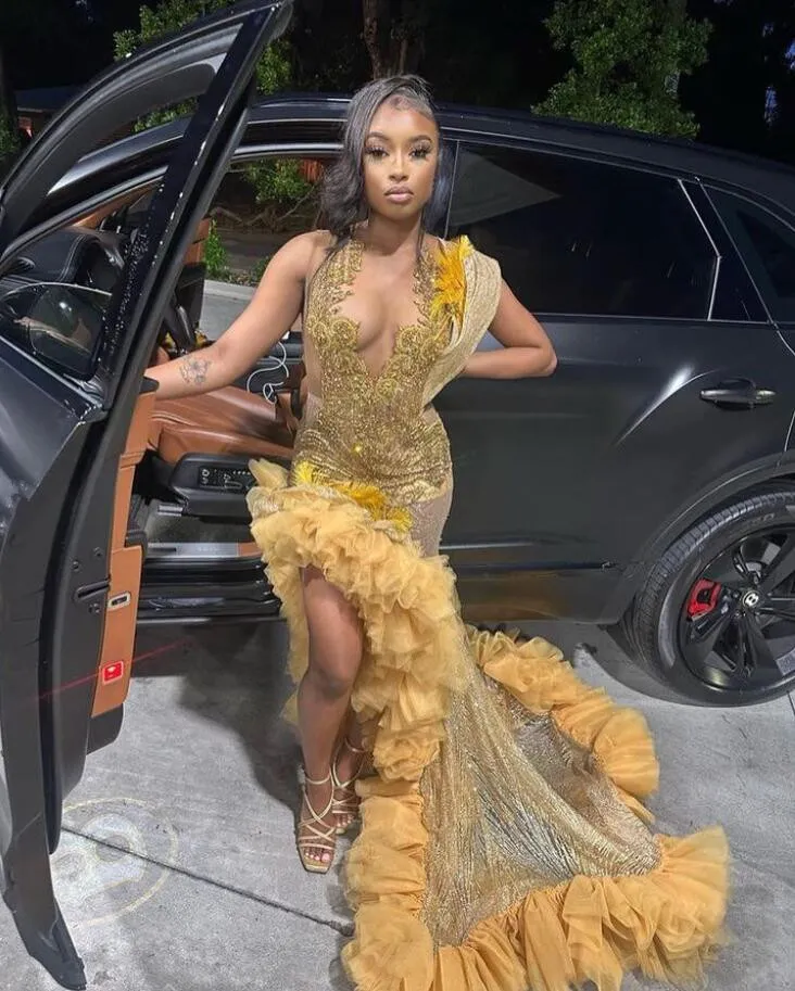 Vestido de fiesta de lujo con cuentas doradas para niñas negras, vestido de noche formal de sirena con cristales, vestido de noche con abertura lateral Y6624