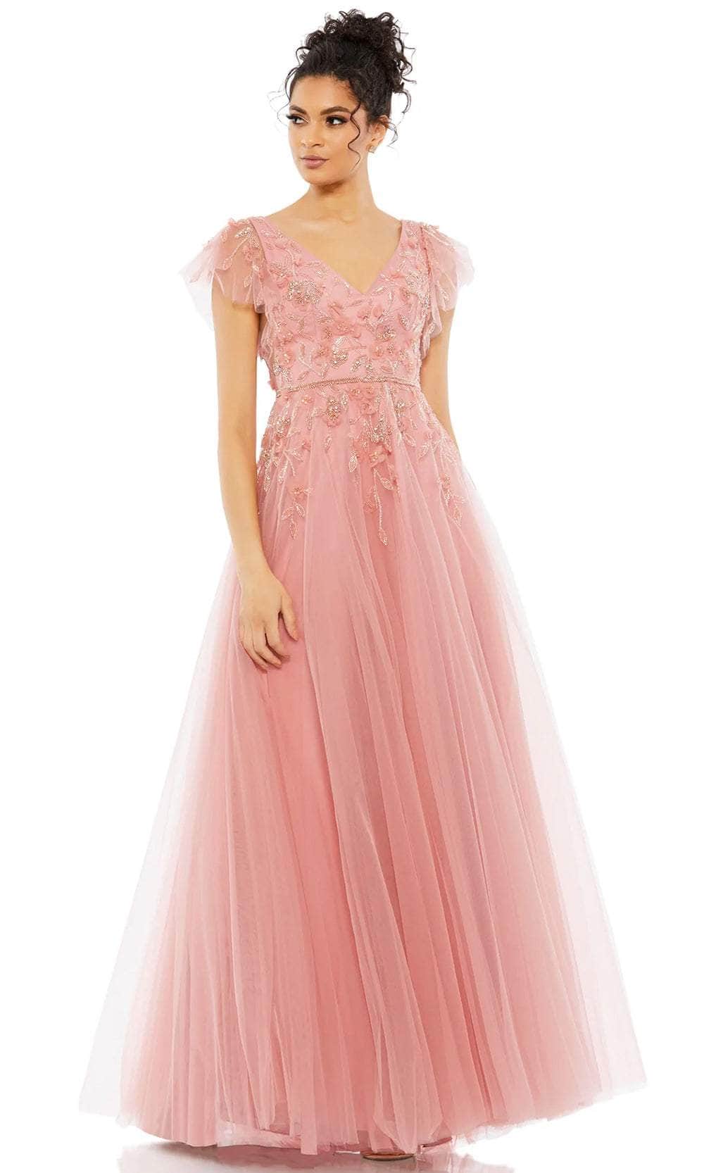 Luce fantástica desde cualquier ángulo y cautiva a todos con este vestido Mac Duggal 11224. Adornado con apliques florales tridimensionales con detalles de cuentas y lentejuelas, este vestido deslumbra con su escote en V y mangas cortas con volantes. La cintura bordada a mano con cuentas le aporta un toque de elegancia. La espalda, completamente descubierta, se cierra con cremallera. La falda de tul crea una silueta en A. Con esta impresionante creación de Mac Duggal 11224, irradiarás la máxima elegancia. La modelo luce el color salmón.