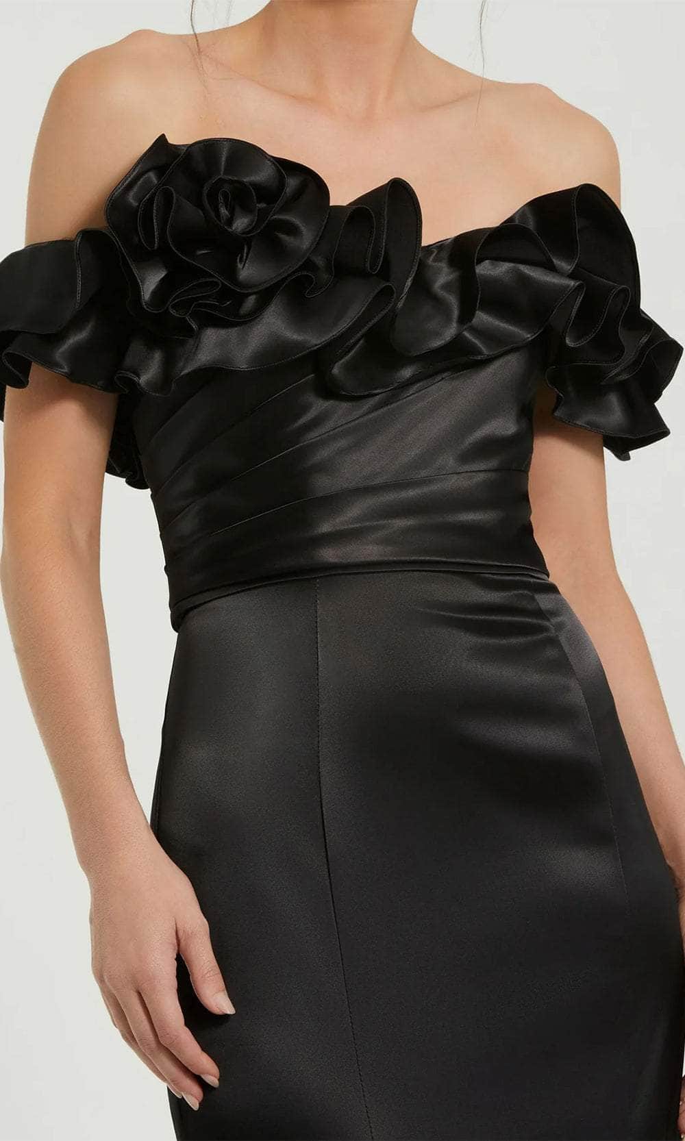 Deslumbra en la alfombra roja con esta obra maestra de Mac Duggal, el vestido 49834. Luce pliegues asimétricos en el corpiño y un escote barco con volantes, creando un look elegante e impactante. Además, presenta mangas cortas y una sensual espalda descubierta con cierre de cremallera invisible. La falda de corte sirena está diseñada con costuras esculpidas para realzar su silueta y cuenta con un godet para mayor volumen. Disfruta de la elegancia atemporal con este vestido de Mac Duggal, el 49834. La modelo lo lleva en color negro.