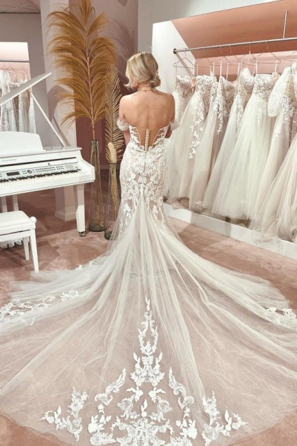 Este impresionante vestido de novia presenta una silueta de sirena, escote corazón y hombros descubiertos. El tul hasta el suelo crea un look fabuloso y elegante, mientras que los apliques añaden un toque de delicado detalle. Perfecto para la novia moderna que busca un look atemporal y único en su día especial.