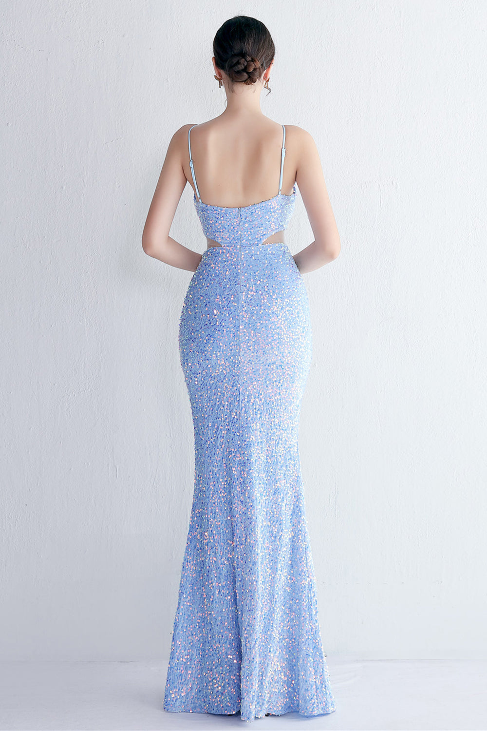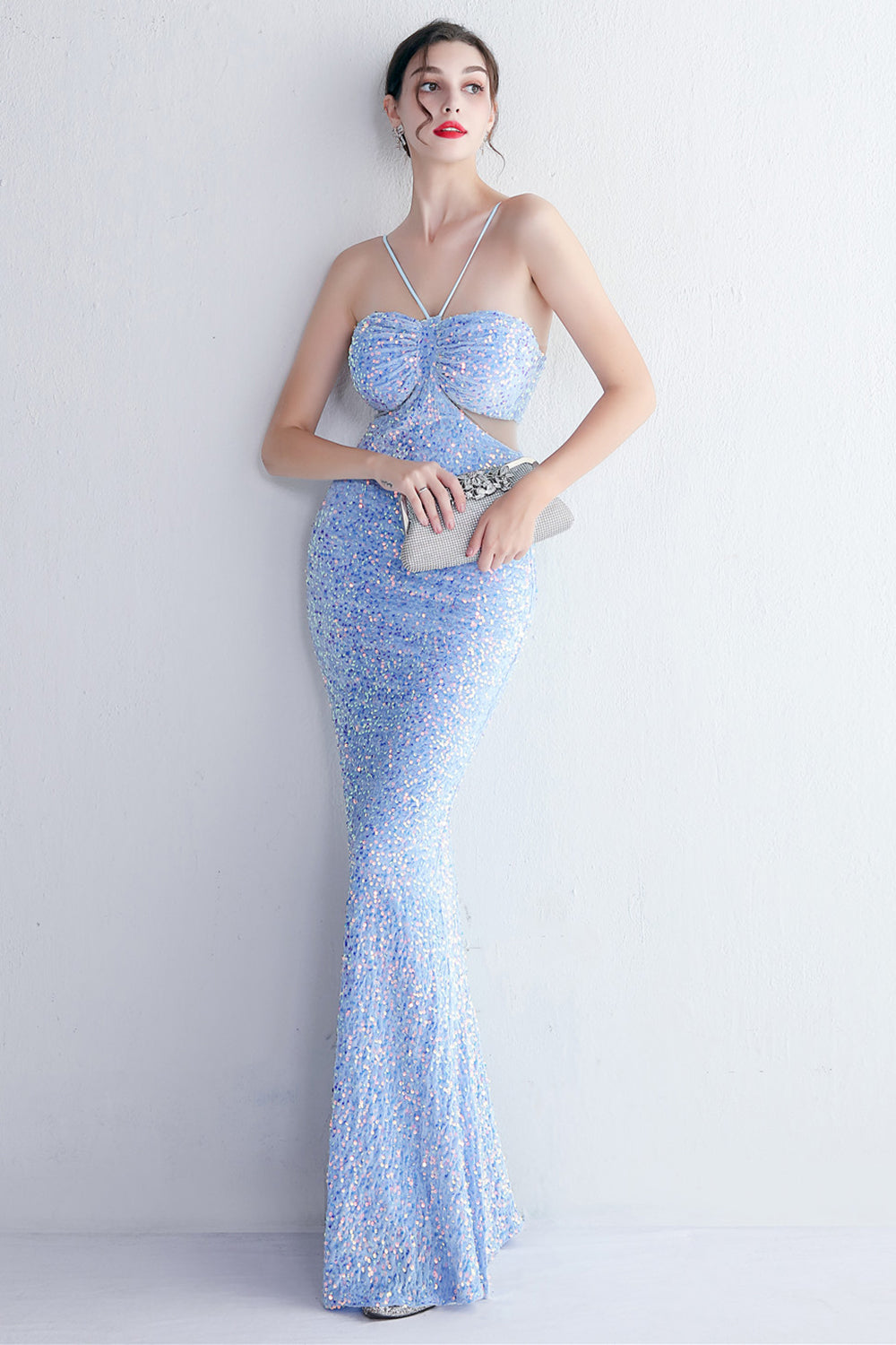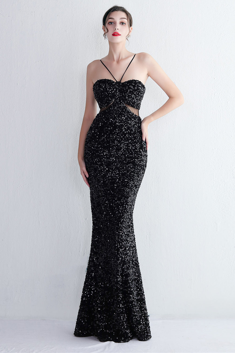 Vestido largo de fiesta negro con lentejuelas, estilo sirena, escote halter y abertura en forma de ojo de cerradura