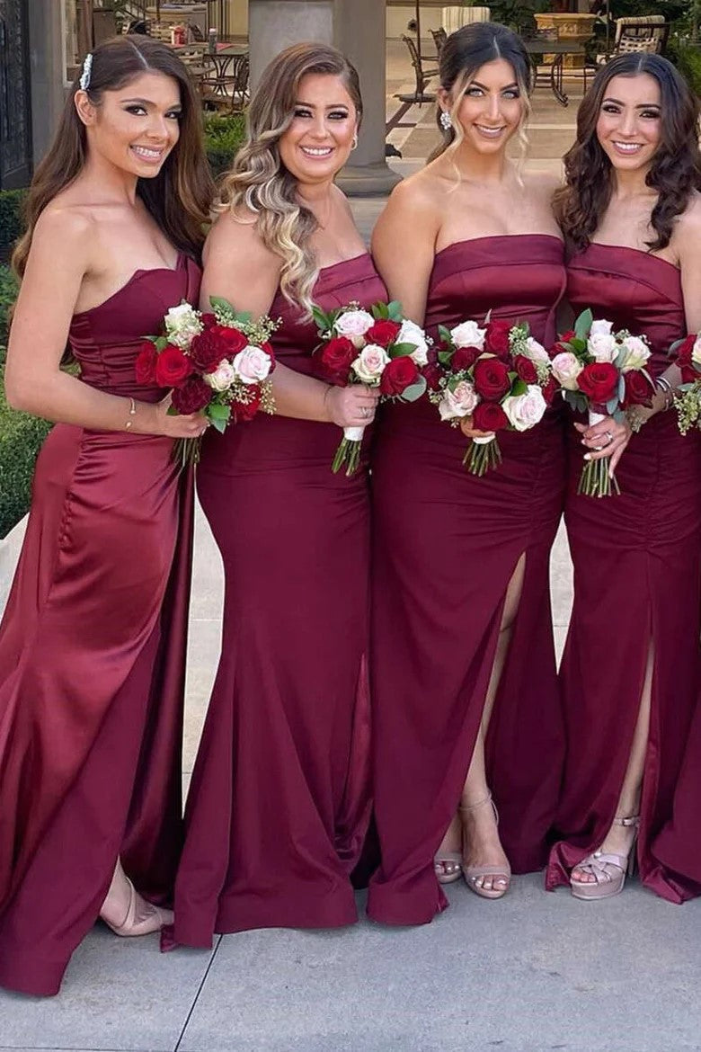 Realza el look de tu cortejo nupcial con nuestro vestido de dama de honor color burdeos, corte sirena y sin tirantes. Este vestido combina elegancia y sensualidad con su silueta de sirena, su vibrante color burdeos y su seductora abertura. Perfecto para damitas de honor, este vestido hará que tu cortejo nupcial se sienta seguro y con estilo.