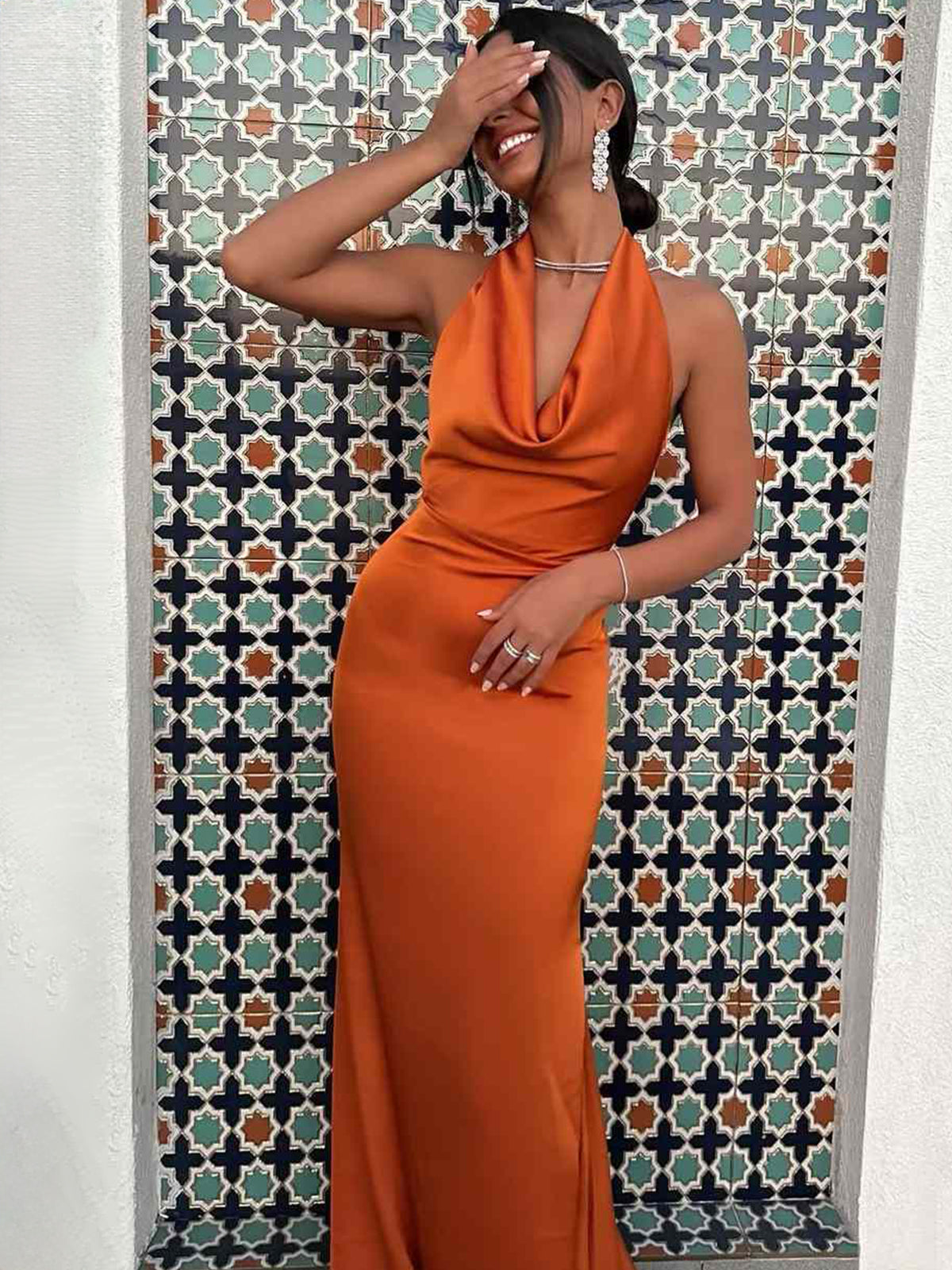 Este cautivador vestido de corte sirena, disponible en vibrante naranja y rico satén burdeos, está diseñado para robar miradas. El escote halter añade un toque chic y favorecedor, mientras que la silueta sin mangas irradia sofisticación moderna. Una opción elegante, ideal tanto para la noche como para eventos formales. Destaca por sus adornos plisados, que crean un impresionante efecto texturizado que complementa la silueta ceñida. Con una cola que aporta un toque dramático y una espalda con cordones para un ajuste personalizado, este vestido es perfecto para quienes desean lucir elegantes y audaces en su próximo evento formal.