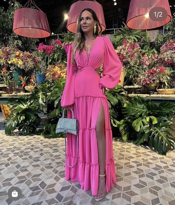 Vestido de noche modesto de corte A, escote en V, mangas largas y abertura Y7178