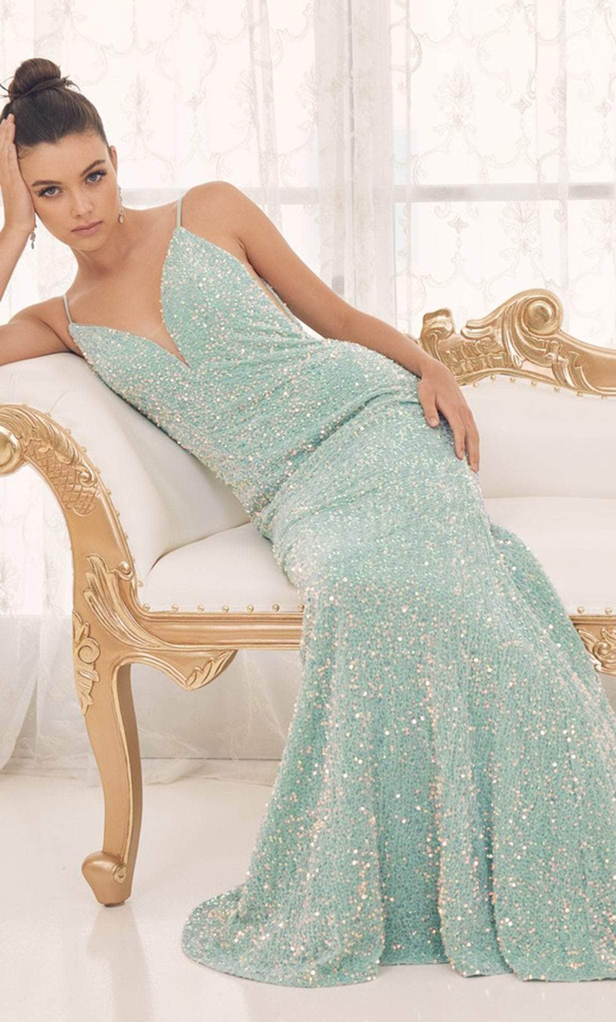 Luce un estilo sumamente femenino con esta exquisita creación de Nox Anabel R1071. Deslumbrantemente adornado con lentejuelas brillantes y con líneas impecables, este vestido presenta un escote en V pronunciado con un detalle de tul ilusión y tirantes finos. Con una espalda abierta en V y cierre de cremallera, esta pieza deslumbrante crea una silueta de sirena que cae en una elegante cola. Irradia sofisticación y estilo en tu evento con esta obra maestra de Nox Anabel. Las modelos lucen los colores fucsia, dorado, verde menta y rojo.