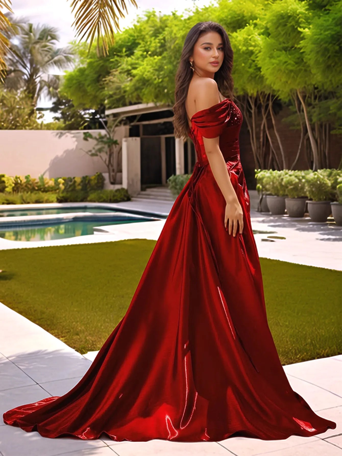Vestido largo de fiesta de satén plisado con lentejuelas, hombros descubiertos y corte en A con abertura