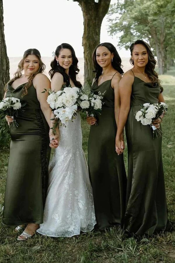 Vestidos largos de dama de honor de satén color oliva, corte tubo, cuello drapeado y tirantes finos.