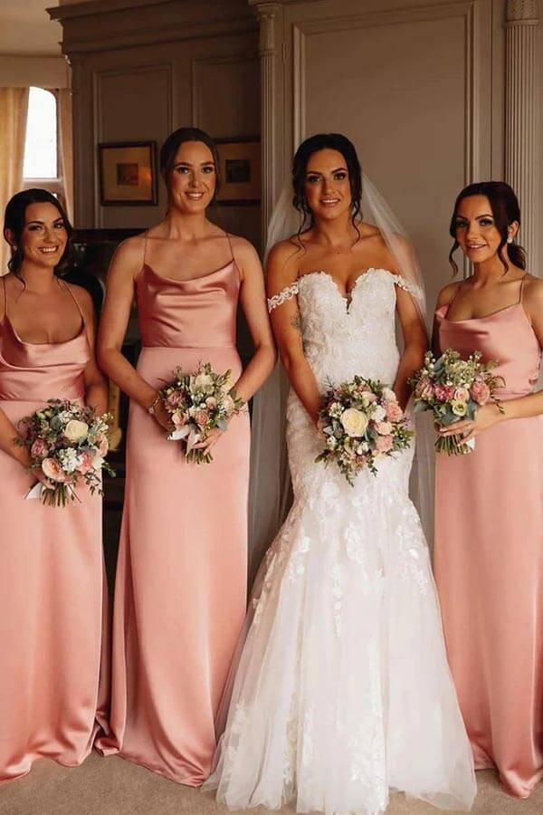 Vestidos de dama de honor largos hasta el suelo en satén de seda rosa. Vestidos para la fiesta de bodas. MBD209