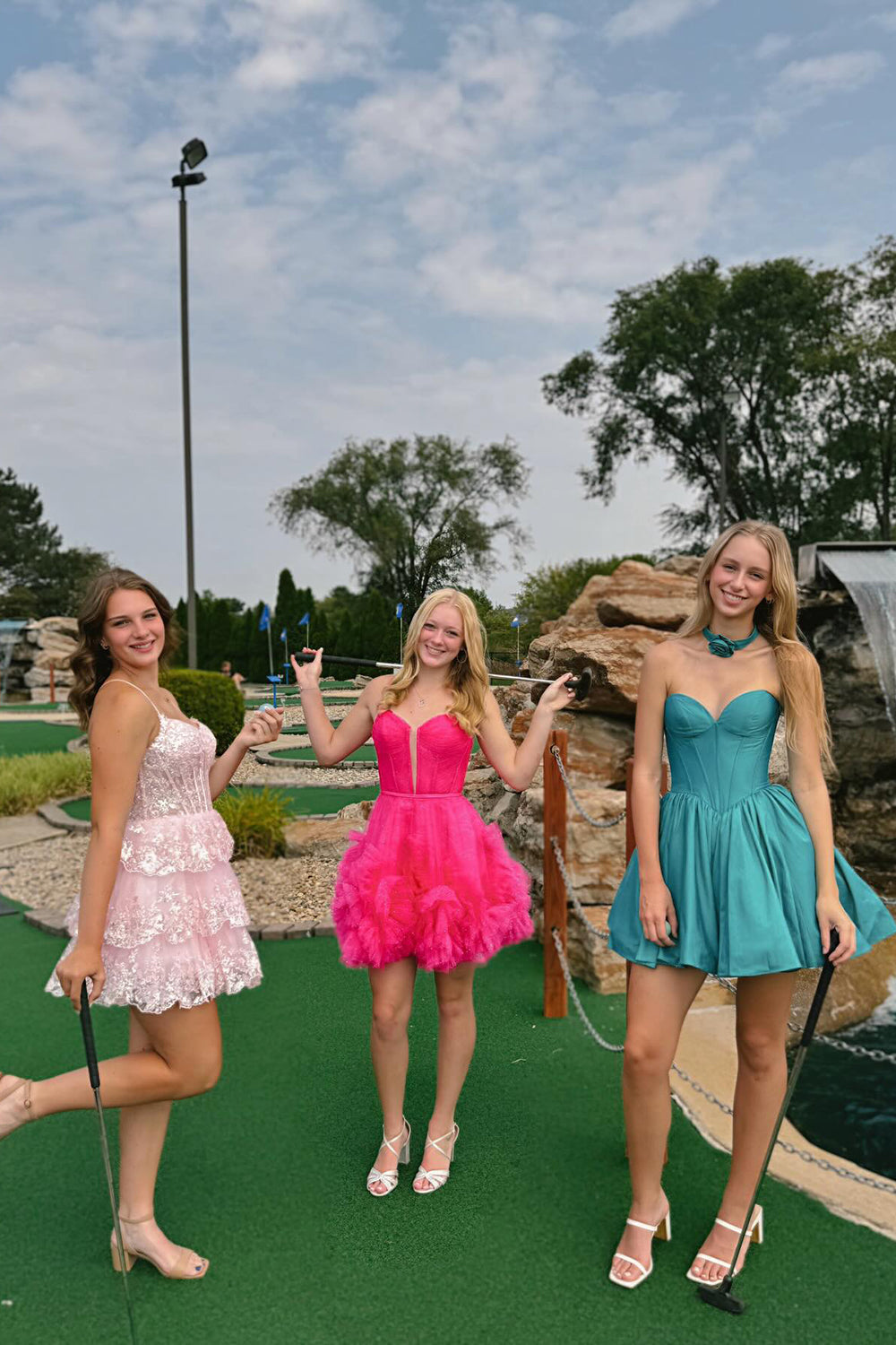 Vestido corto de fiesta de bienvenida de satén sin tirantes, corte en A y corsé