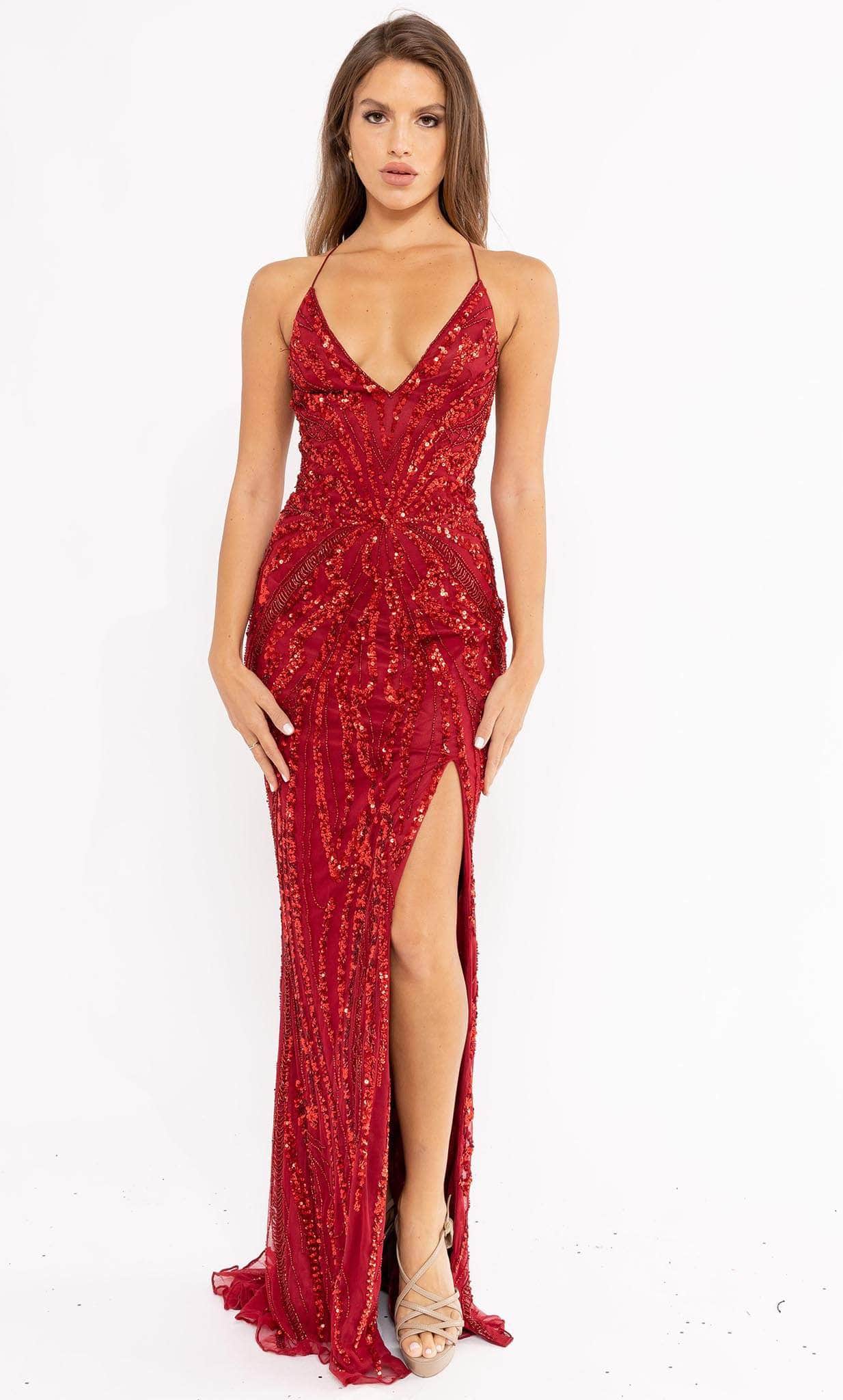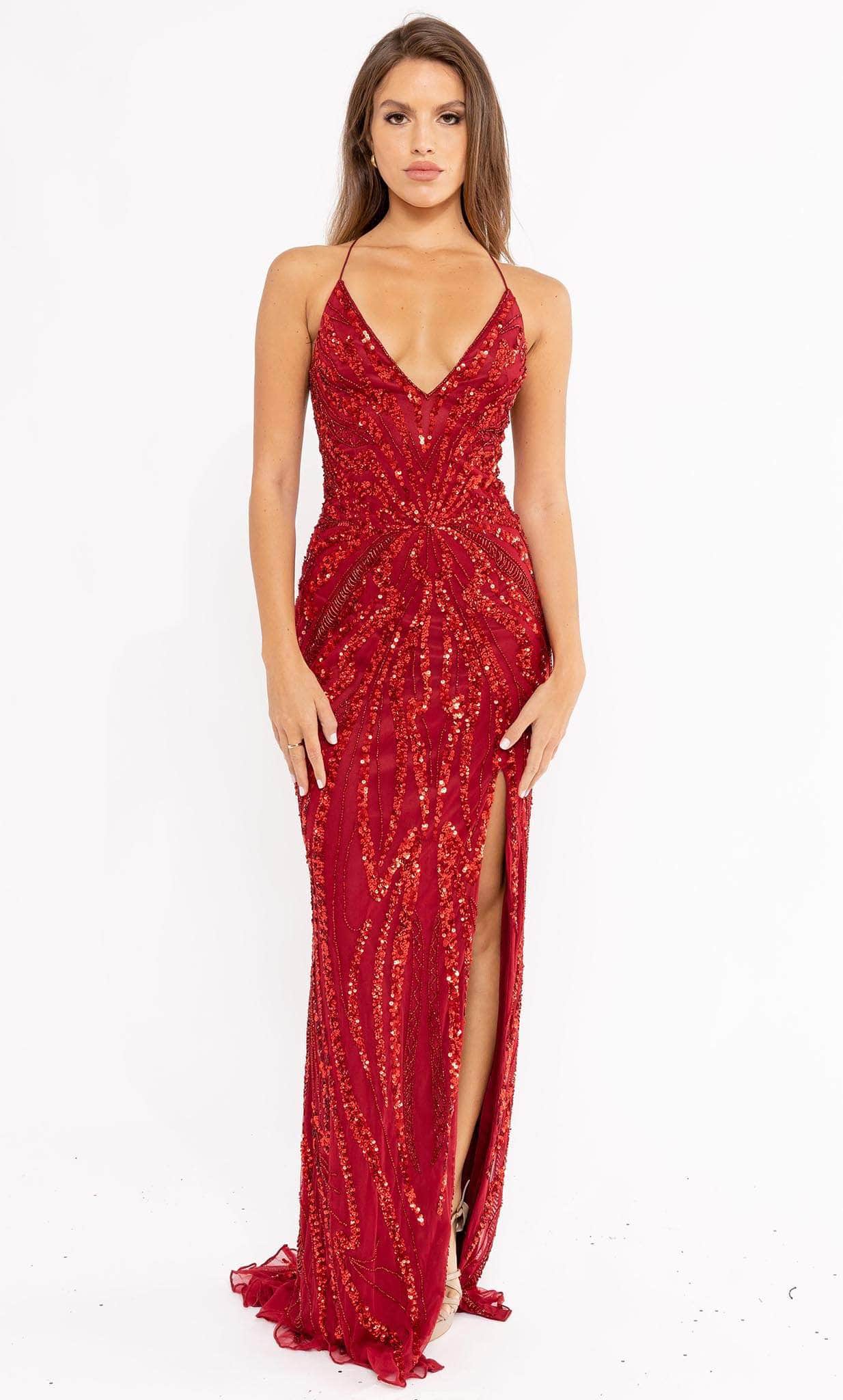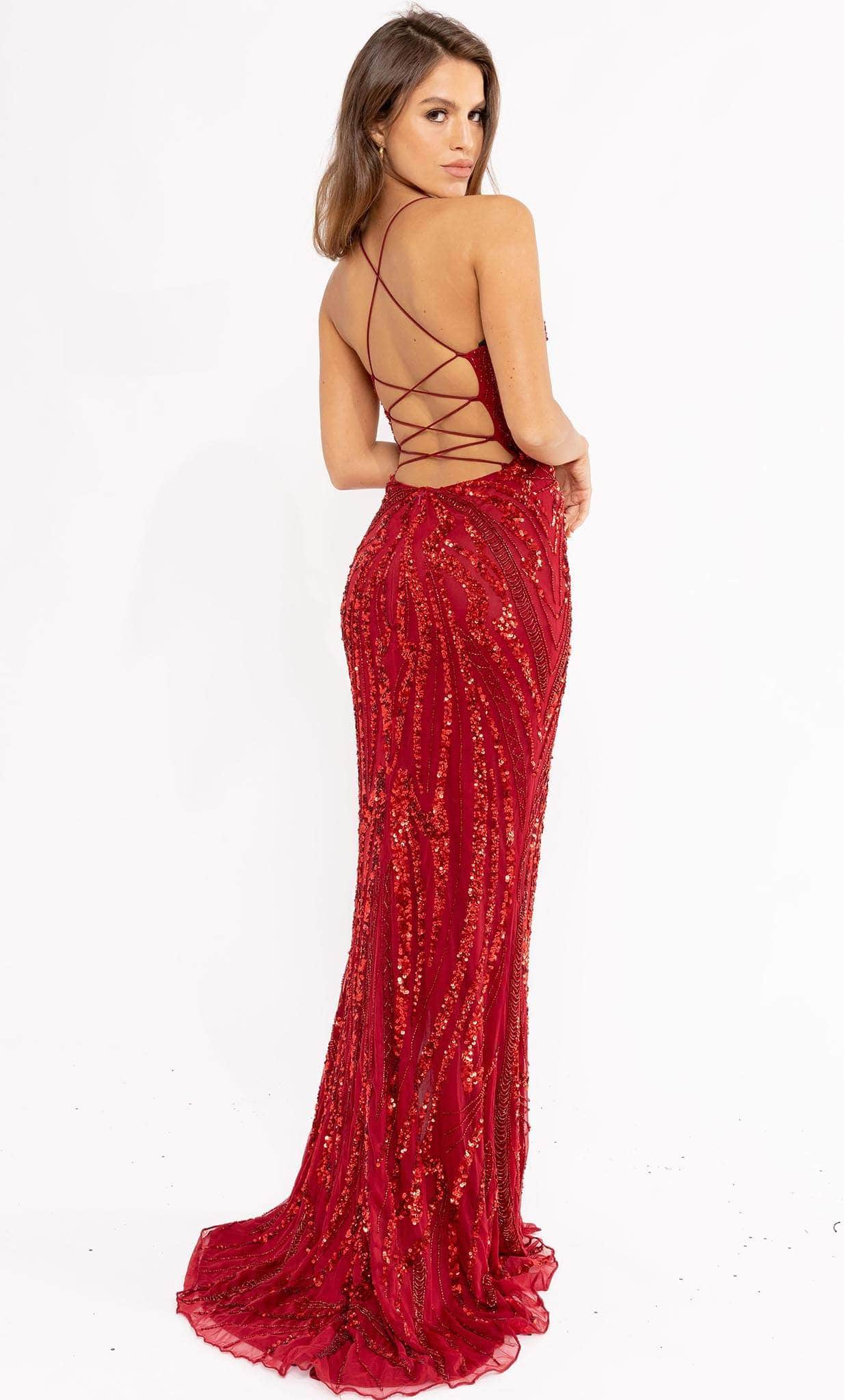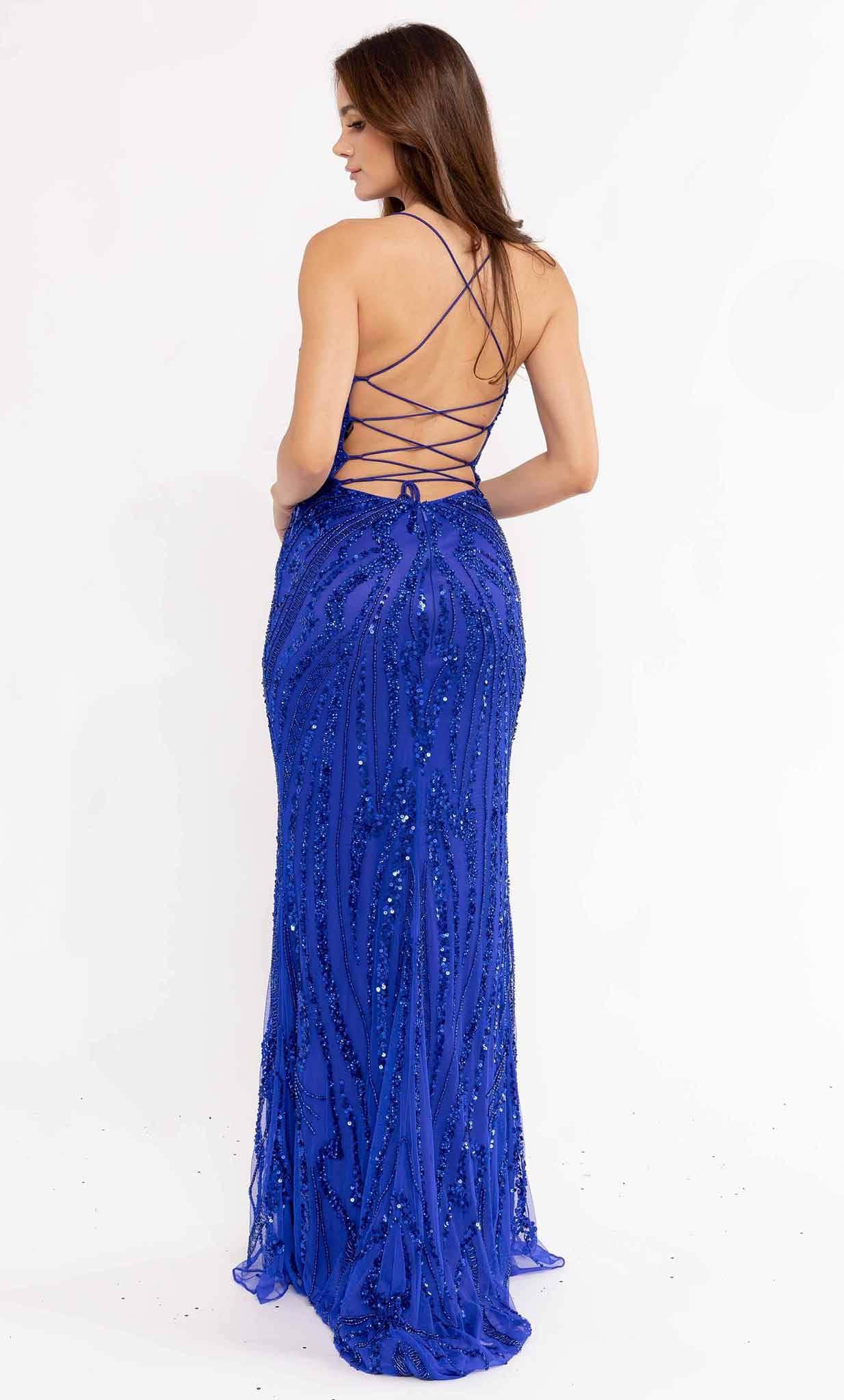 Deslumbra con este precioso vestido de Primavera Couture 3958. Este elegante diseño luce un profundo escote en V con tirantes finos que se unen en un lazo en la espalda descubierta. El vestido ajustado está adornado con una combinación de pedrería y lentejuelas en un patrón contrastante, que te brindará un brillo radiante durante toda la noche. La falda tubo se abre con una abertura en la pierna y cae con gracia hasta el dobladillo, culminando en una elegante cola. ¡Esta obra maestra de Primavera Couture 3958 te hará sentir especial! Las modelos lucen los colores Esmeralda, Menta, Rojo y Azul Real.