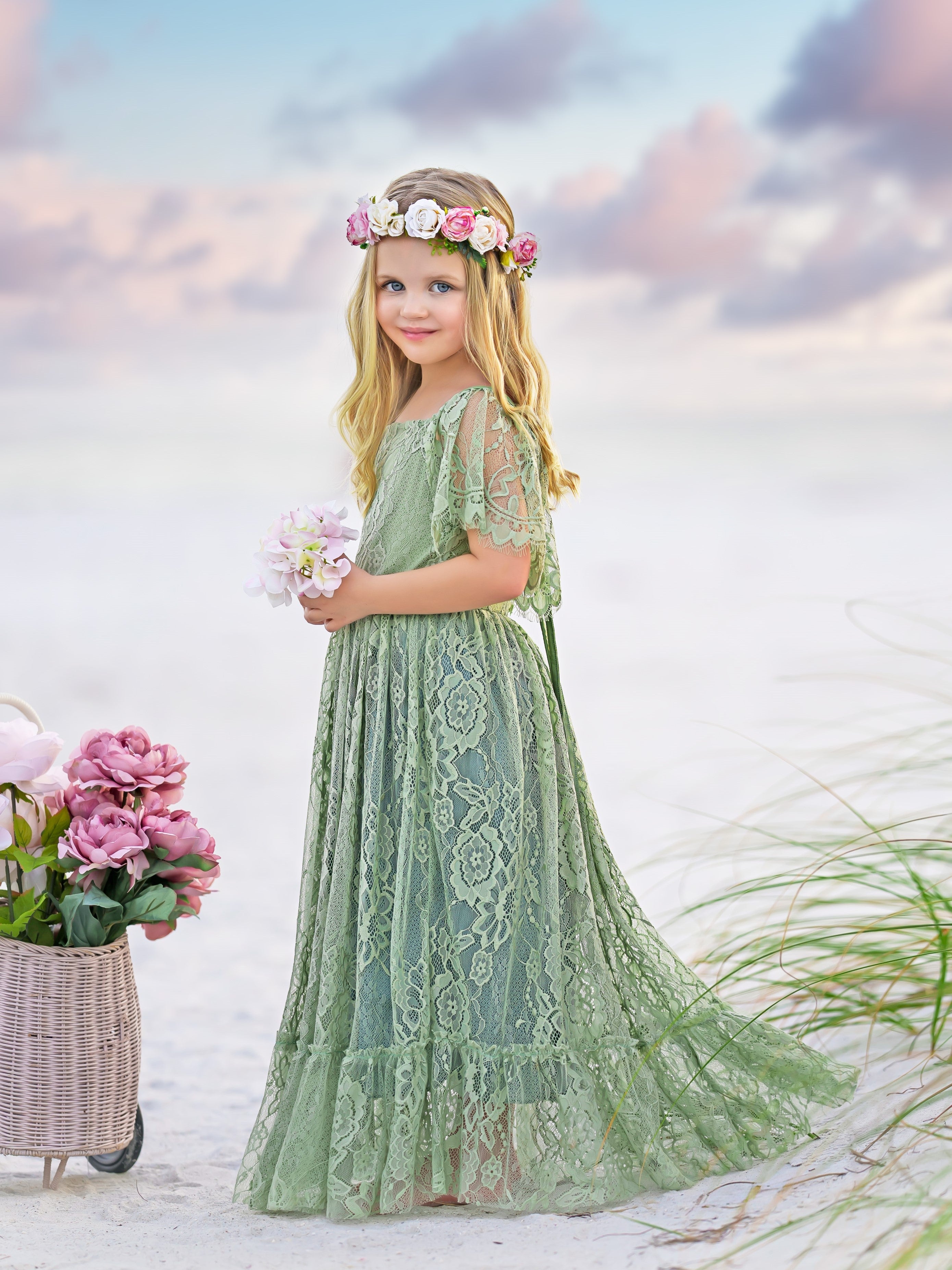 Vestido bohemio de encaje verde salvia para resort de playa con flores