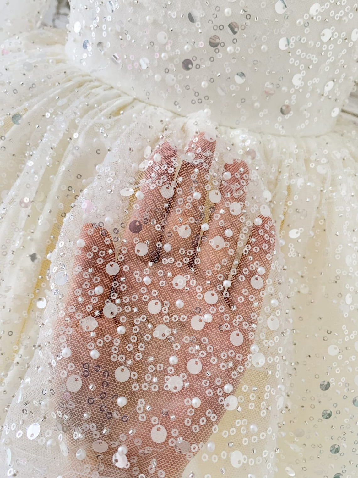 Vestido de cumpleaños de niña color marfil satinado hasta la rodilla