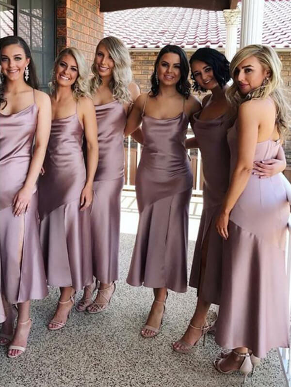 Vestidos de dama de honor de satén, corte tubo, tirantes finos, cuello drapeado y largo hasta la rodilla.