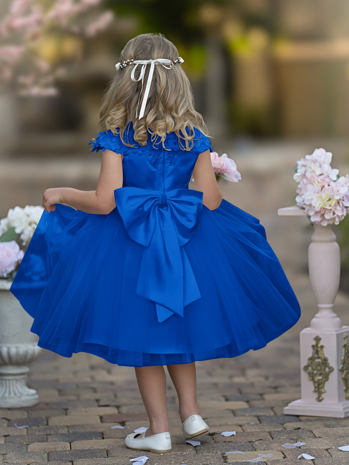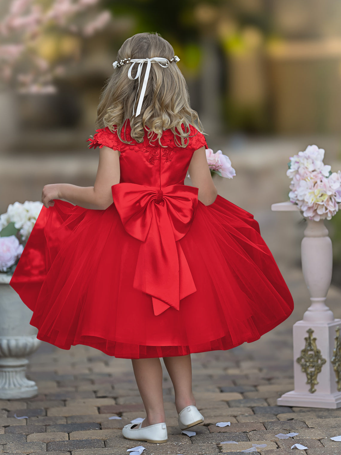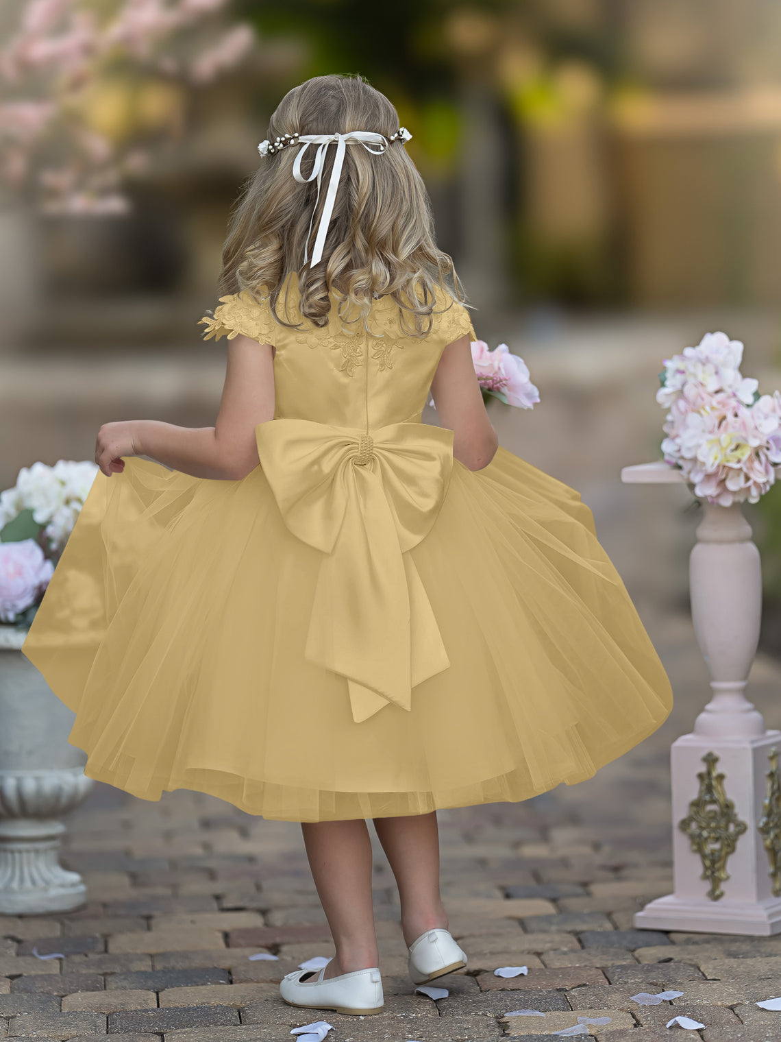 Vestido de niña de las flores de la Primera Comunión, color marfil, de tul satinado hasta la rodilla