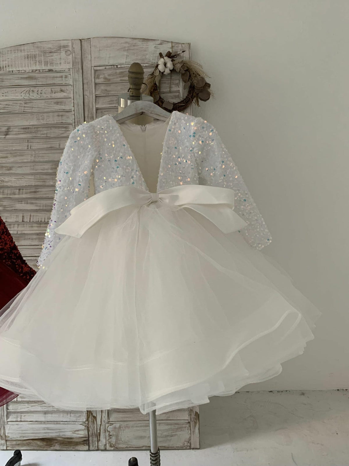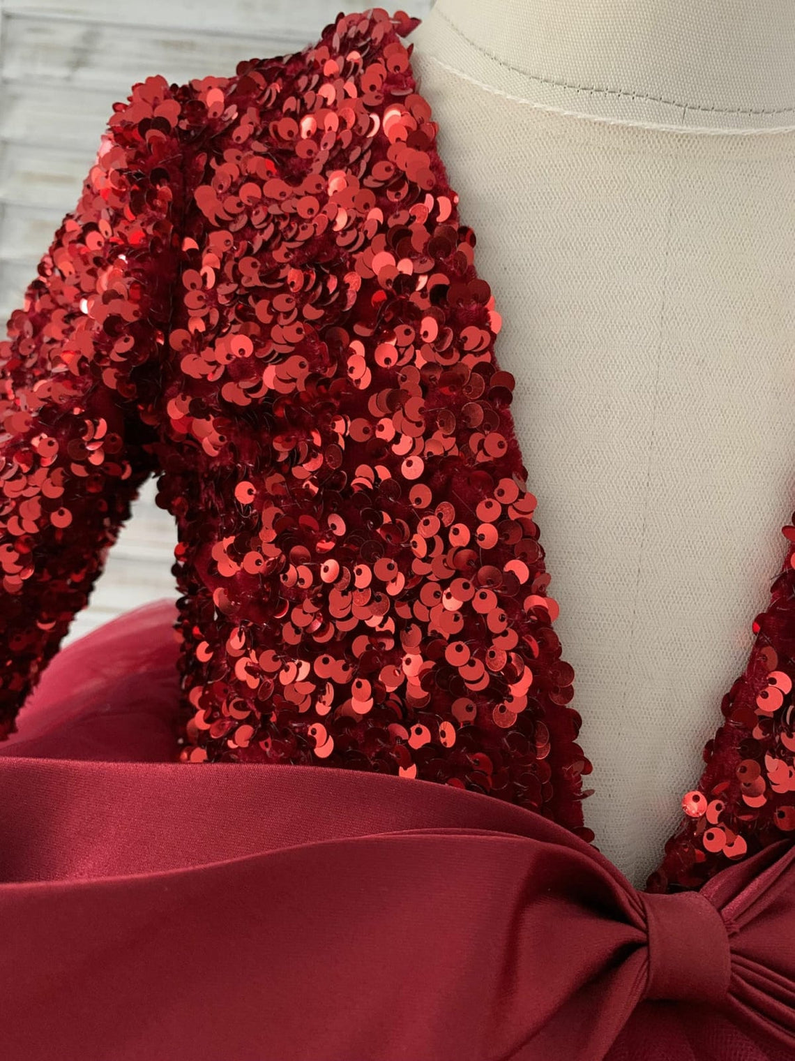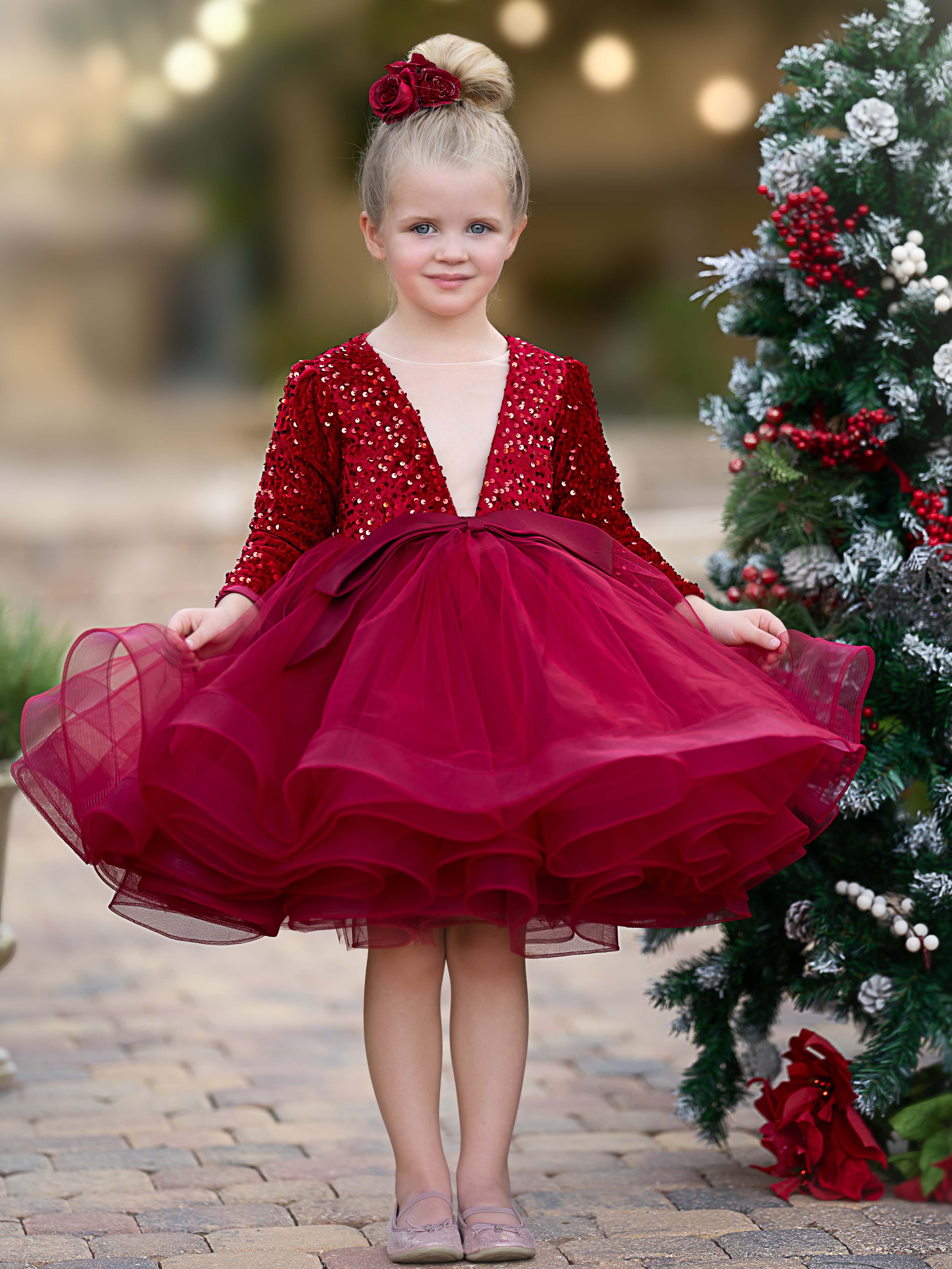 Vestido festivo de tul con escote en V profundo y lentejuelas hasta la rodilla, ideal para fiestas navideñas y de fin de año.