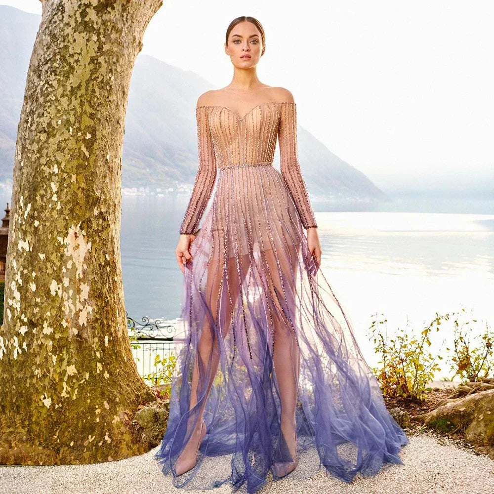 Vestidos de noche largos, elegantes, de corte A, color púrpura árabe, con cuentas, para ocasiones formales LA72752