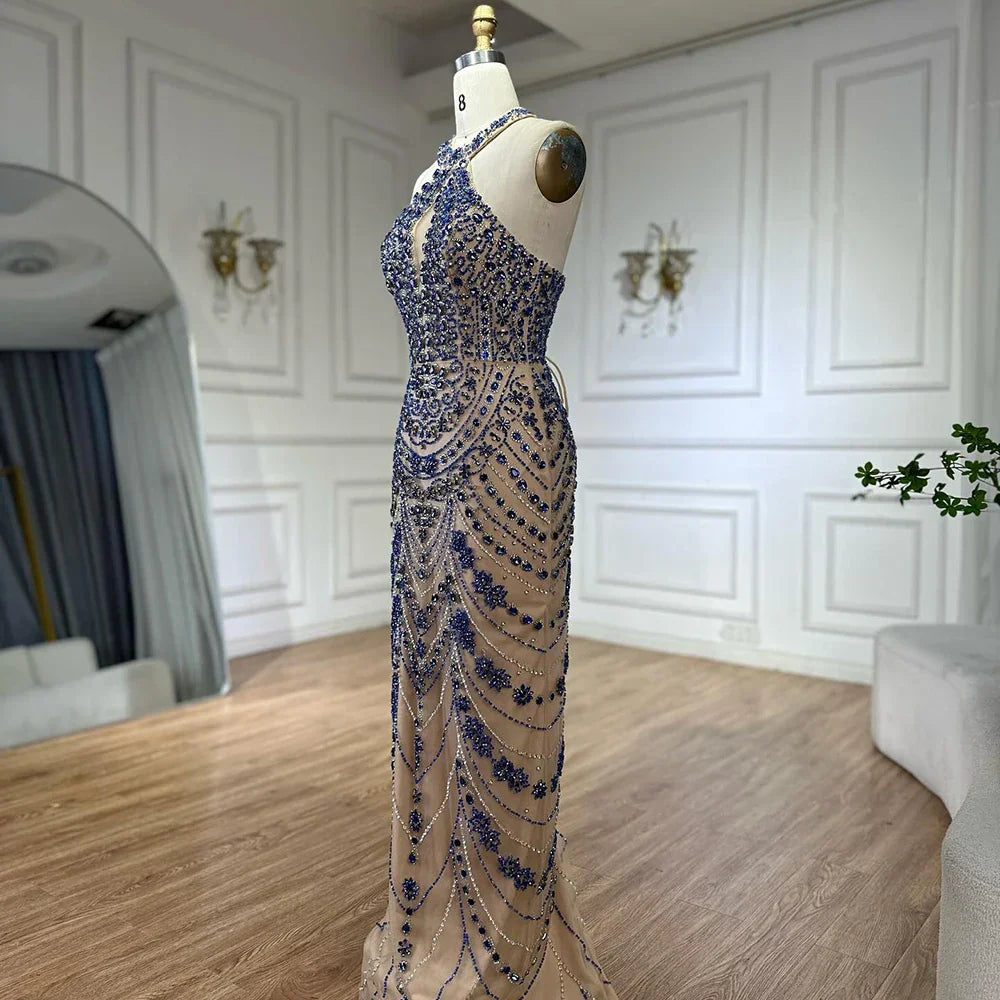 Vestido de noche elegante azul estilo saudí con cuello halter y cuentas de cristal para ocasiones formales LA72760 (modelo 2025)