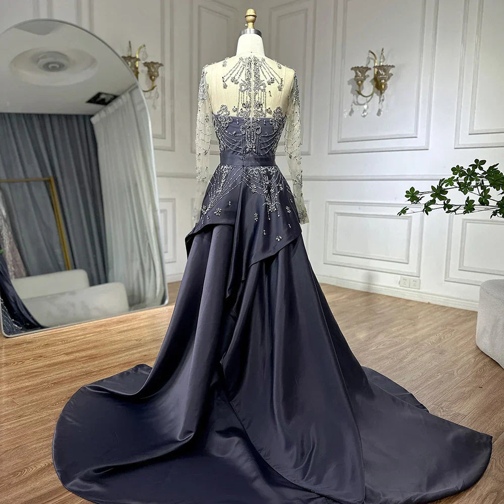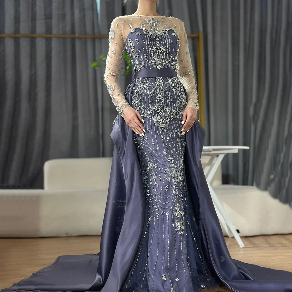El intrincado bordado y las mangas largas le dan un toque de sofisticación, mientras que la sobrefalda le aporta un aire regio y elegante. Perfecto para una boda o evento especial en Dubái, este vestido te hará sentir como una reina.