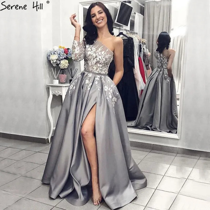 Vestido de noche elegante gris satinado 2025, un hombro, flores hechas a mano, corte en A, vestido formal LA70043