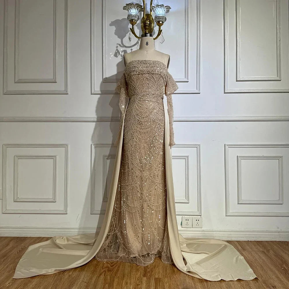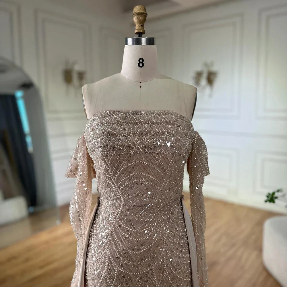 Vestido de noche de sirena con perlas color nude, estilo árabe, con sobrefalda, ideal para ocasiones formales (LA72160B)