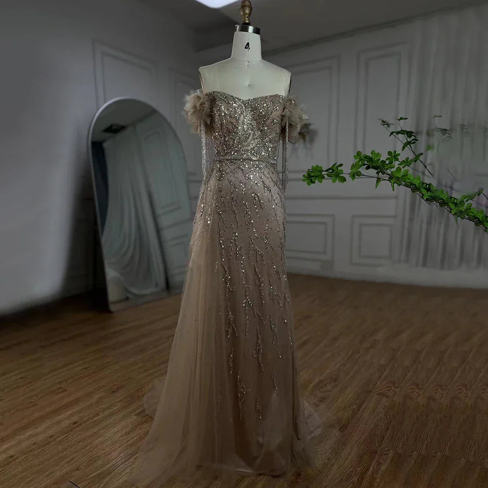 Vestidos de noche de lujo estilo sirena color nude, estilo árabe de Dubái, con cuello barco, borlas y cuentas, para mujer, ideales para bodas y fiestas (2025) LA72260