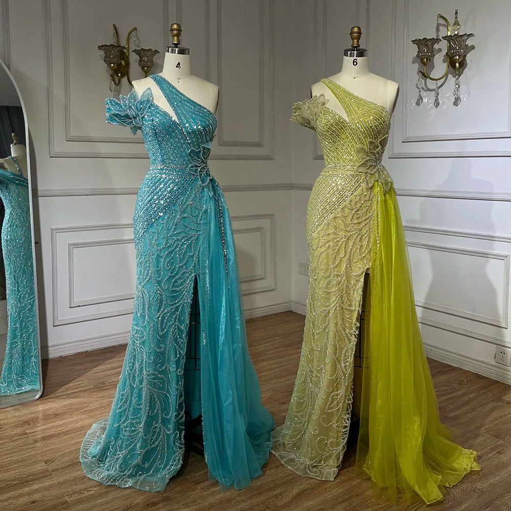 Vestido de noche de sirena con falda de tul y un solo hombro, color fucsia árabe, con cuentas | Boda 2025 LA72599