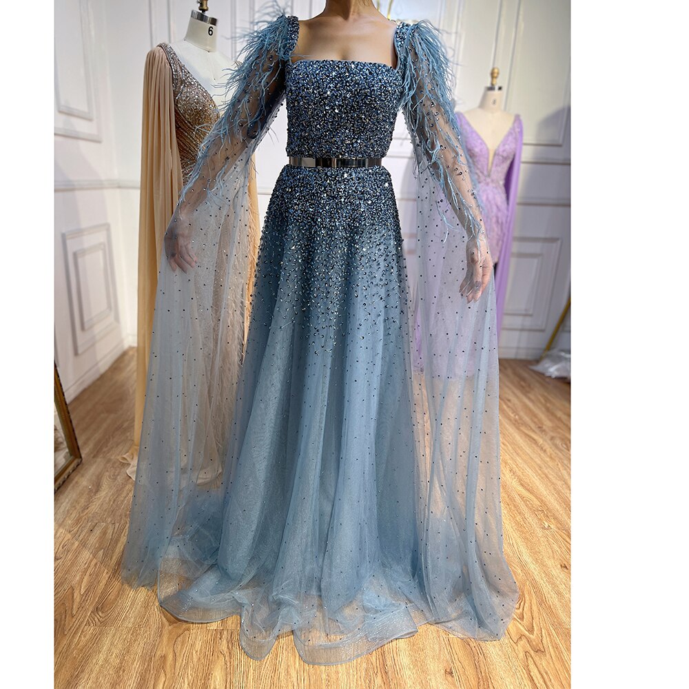 Vestidos de noche de lujo para mujer, estilo árabe, dorado, corte en A, con plumas, mangas tipo capa y cuentas, para fiestas, colección 2025 LA71782