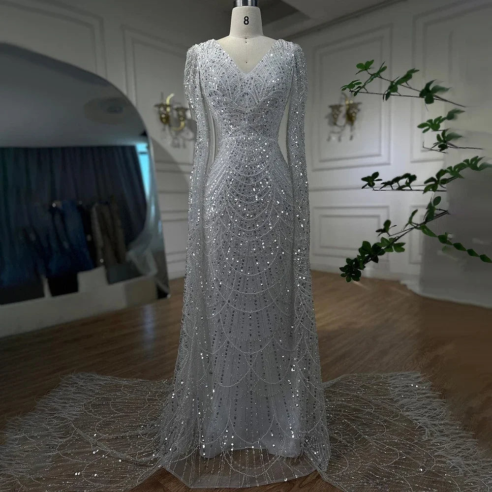 Experimenta la elegancia y el lujo con nuestro vestido de noche blanco de plumas. Con mangas tipo capa para un toque único, este vestido está adornado con delicadas plumas blancas que le dan un aspecto suave y etéreo. Perfecto para eventos formales y ocasiones especiales.