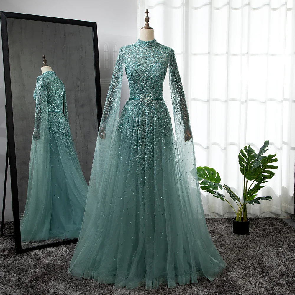 Con preciosas mangas tipo capa y cuello alto, este vestido luce una perfecta fusión de estilos moderno y tradicional. Ideal para cualquier ocasión especial. ¡Sé la estrella de la noche con este impresionante vestido!