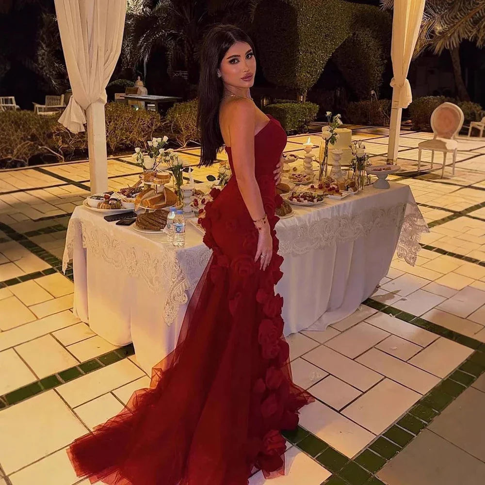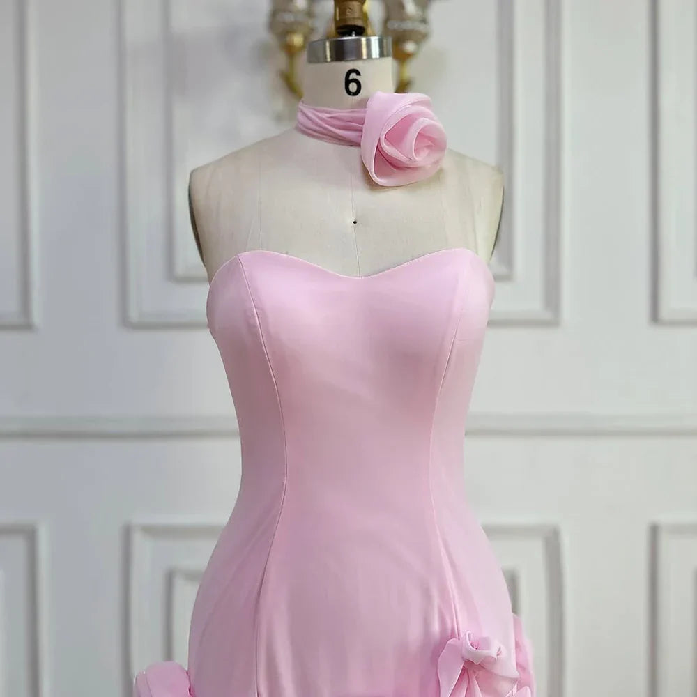 Elegante vestido de noche para niñas, estilo árabe, rosa, con flores 3D. Vestido elegante sin tirantes con abertura lateral. Ideal para fiestas de graduación. LA72568