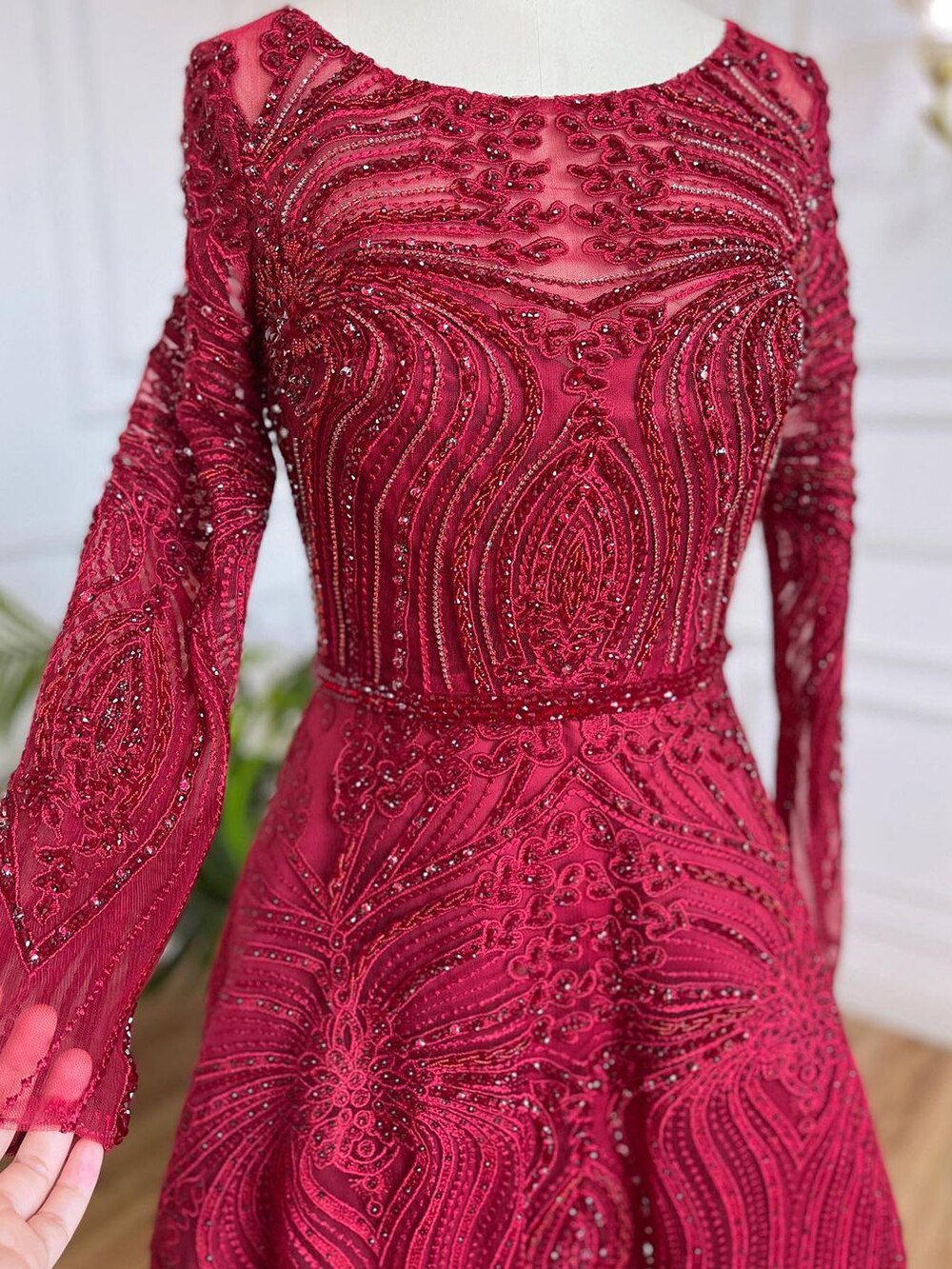 Vestidos de noche musulmanes de lujo en rojo vino, corte A, con cuentas, para mujer, para fiesta de boda, LA71873