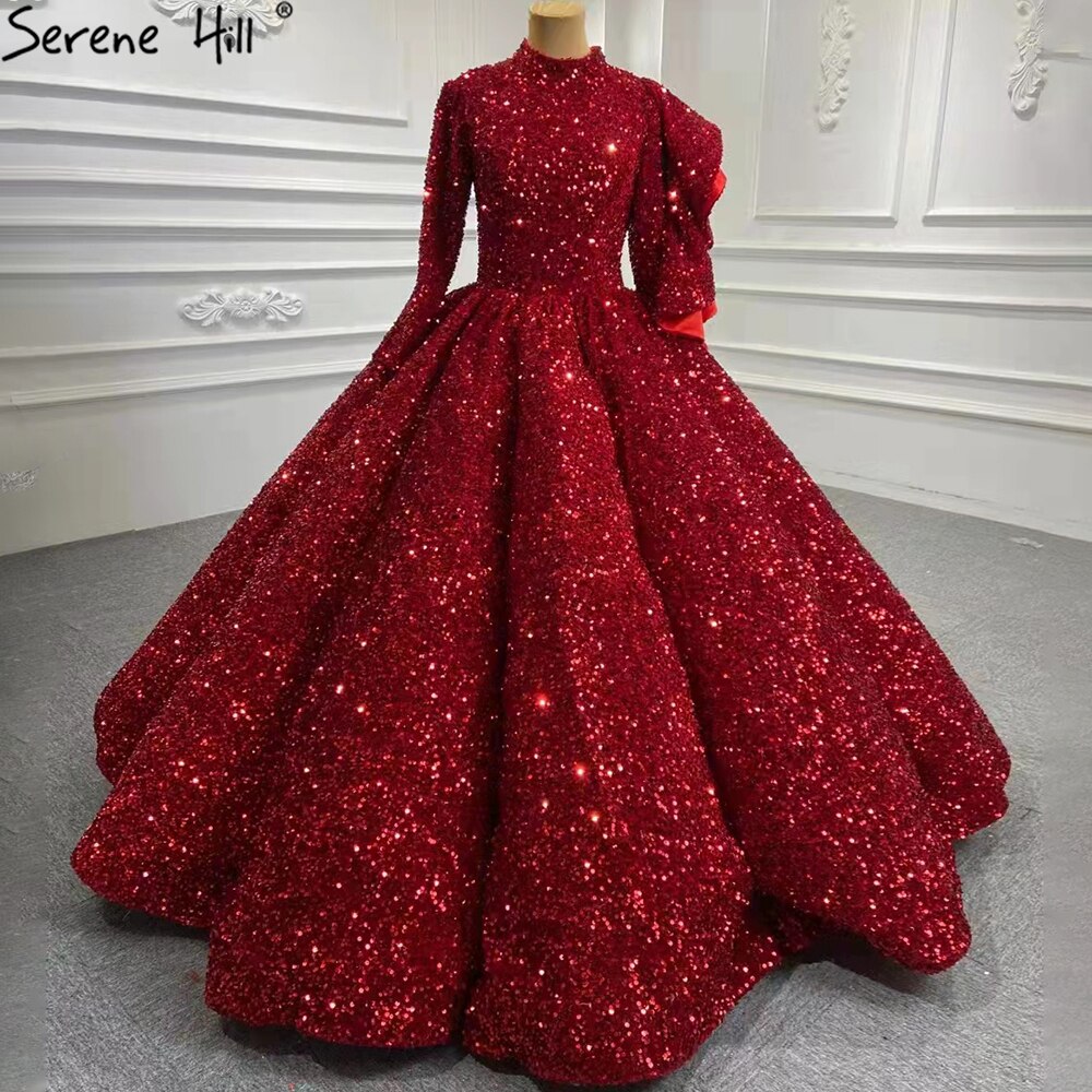 Vestidos de novia musulmanes con lentejuelas en rojo vino 2025, mangas largas, lujosos y brillantes, HA2522, hechos a medida